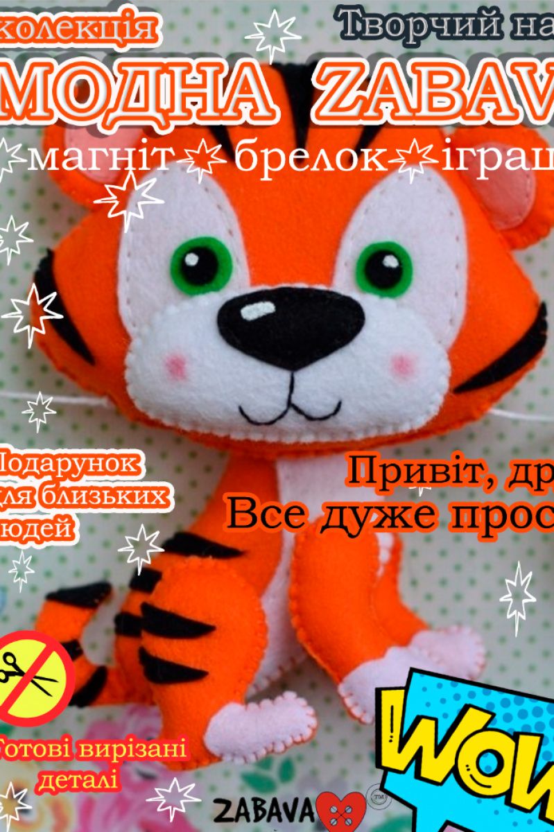 Жил-был тигр. И была у него семья. Самая настоящая крепкая семья - крепкая, надежная. Особенно он любил девочку (имя), которая сшила его своими заботливыми ручками. Милую маленькую рукодельницу звали ... Игрушки из фетра под силу сделать даже умельцам без большого опыта, с нашими наборами, создать игрушку своими руками очень просто, все детали содержатся в наборе уже вырезаны, а маленькие детальки имеют клейкую основу, очень удобно и практично . В наборе есть кольцо для брелока, а так же неодимовый магнит, что делает нашу игрушку универсальной.