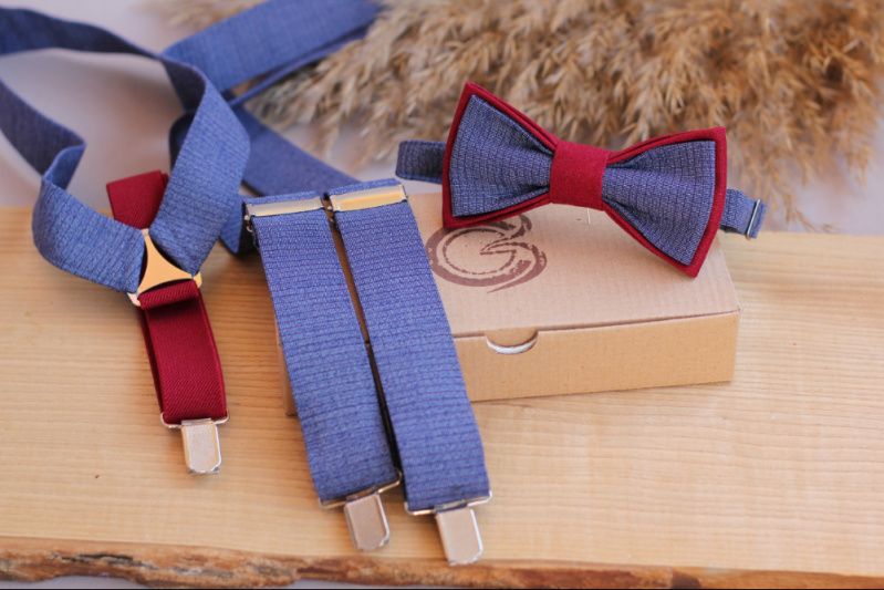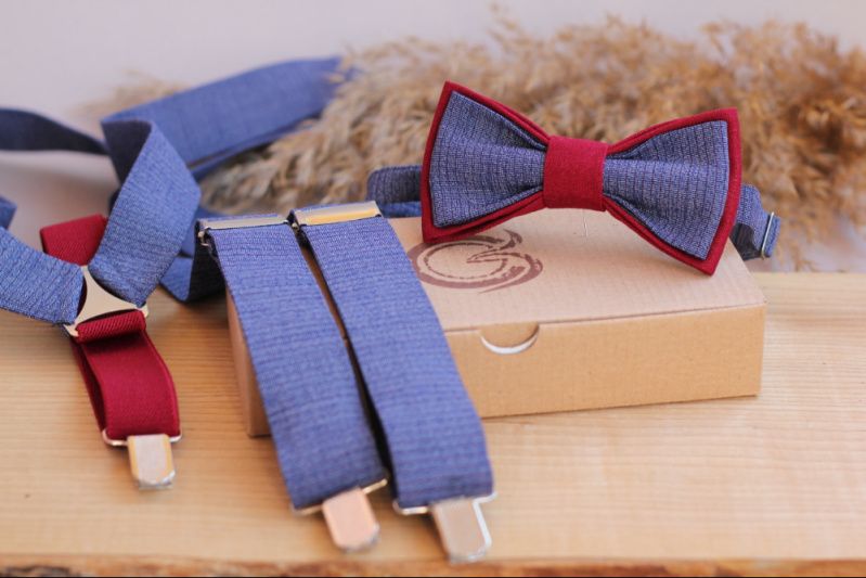 Стильный набор аксессуаров -текстильные подтяжки и бабочка ручной работы с качественной металлической фурнитурой для подтяжек- зажимами с пластиковыми вставками для хорошей фиксации на поясе и специальными пряжками-крокодилами для регулировки длины и резинкой сзади,
