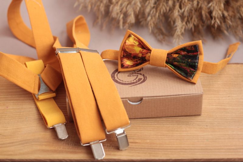 Стильный набор аксессуаров -текстильные подтяжки и бабочка ручной работы с качественной металлической фурнитурой для подтяжек- зажимами с пластиковыми вставками для хорошей фиксации на поясе и специальными пряжками-крокодилами для регулировки длины и резинкой сзади,