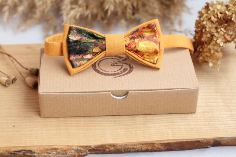 Бабочка двойная из льна шафранового цвета в сочетании с ярким принтом