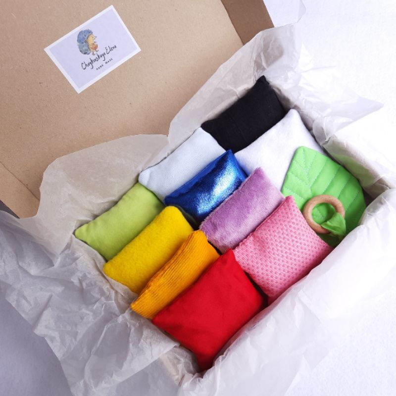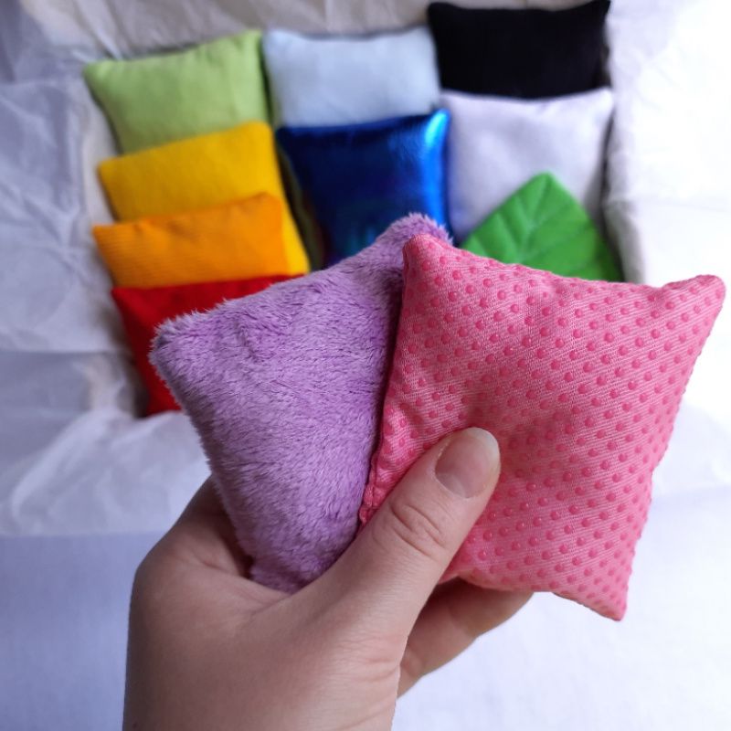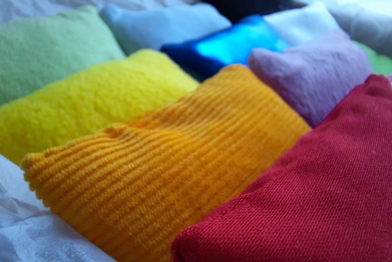 Мешочки изготовлены из качественных тканей разных фактур по цветам радуги + розовый, черный и белый.