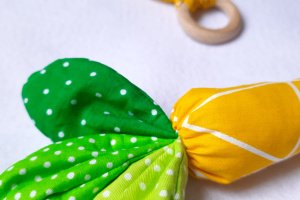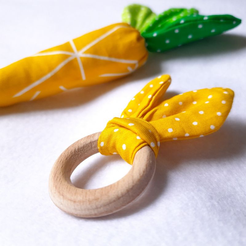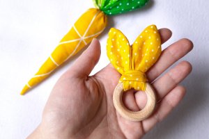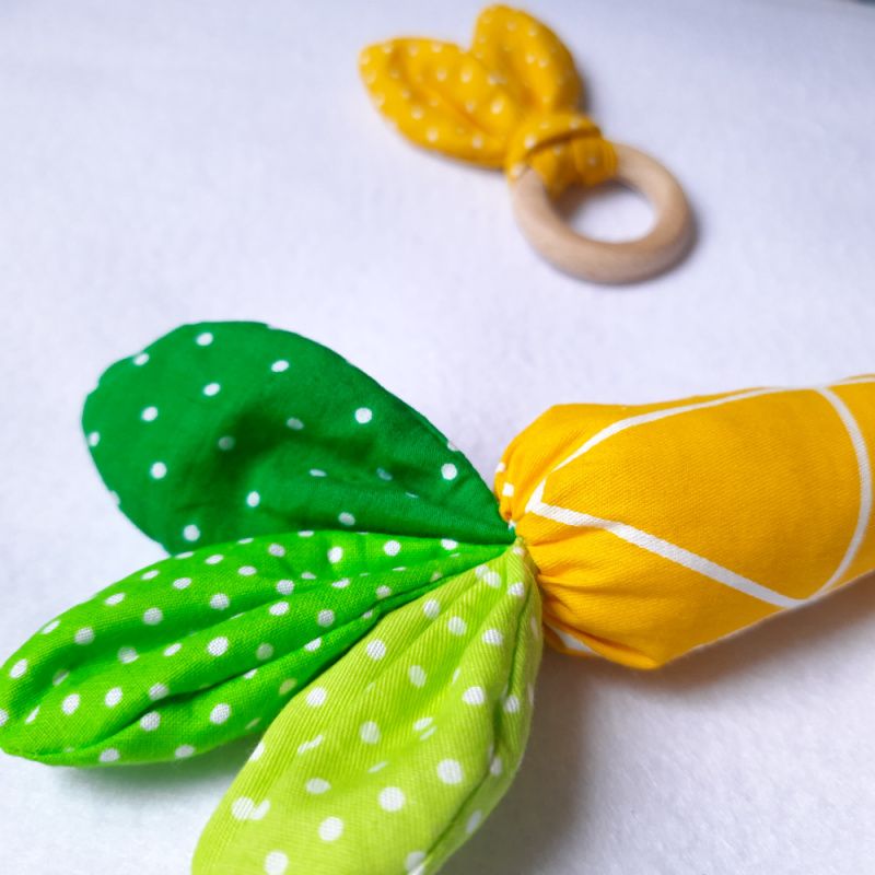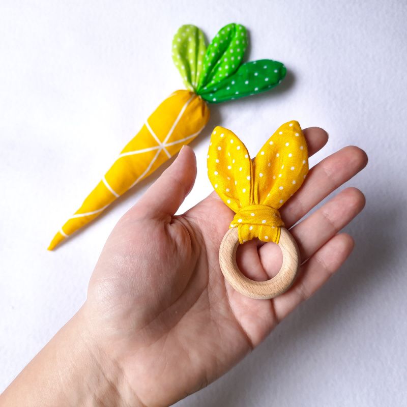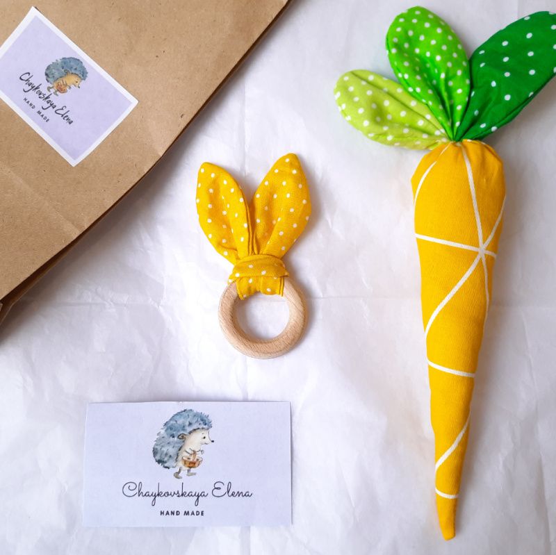 Ботва морковки шуршит, внутри самой морковки вшита пищалка, если ее нажать она весело пищит)) Деревянный буковый ЭКО грызунок с заячьими ушками станет любимой игрушкой которую еще и погрызть можно))