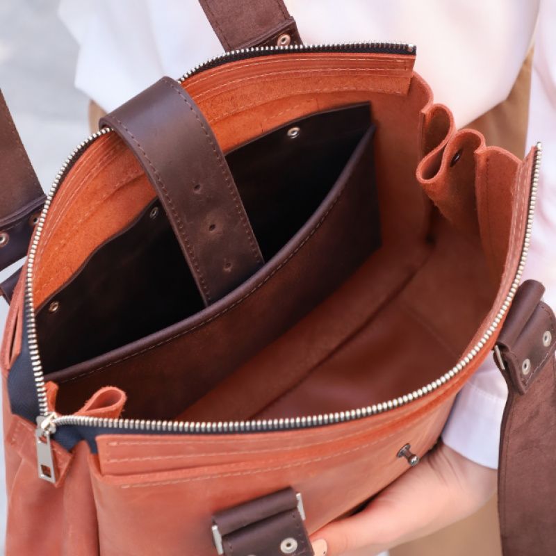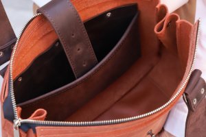 Основной отдел закрывается прочной вшитой молнии + сверху лямкой на бур. Внутри есть большой карман. Ремни двойные, прошитые, размер ручек 74 см.