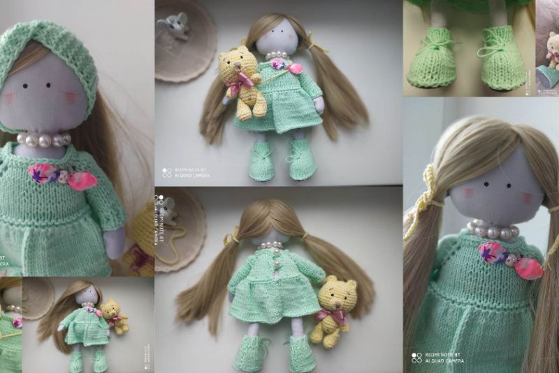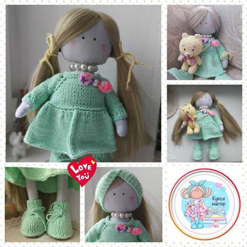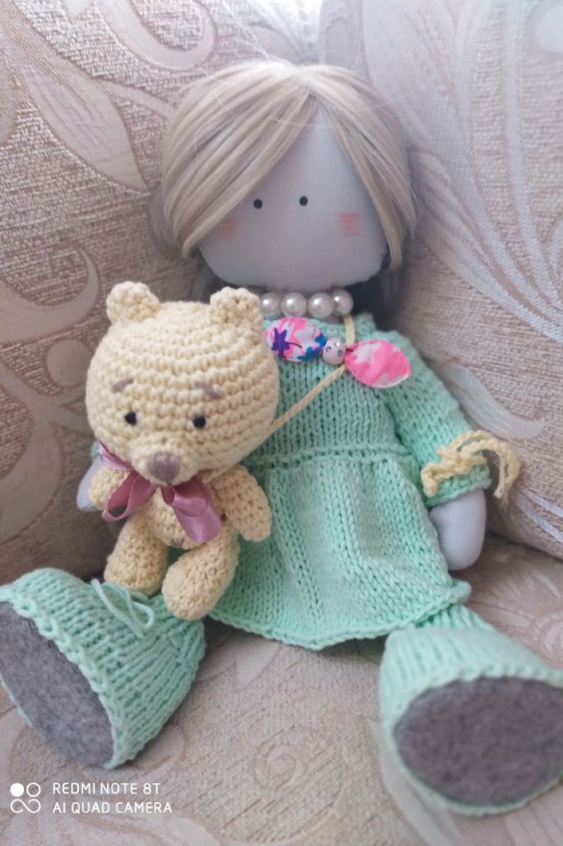 Кукла ручной работы - 30 см. Одежда не снимается. Платье, сапожки - вязаные; наполнитель - холлофайбер; волос - искусственные Треси. Мишка (амигуруми) - 12 см.