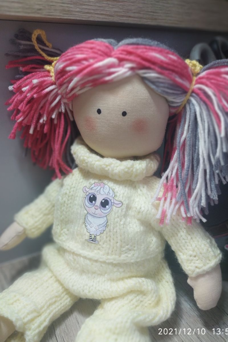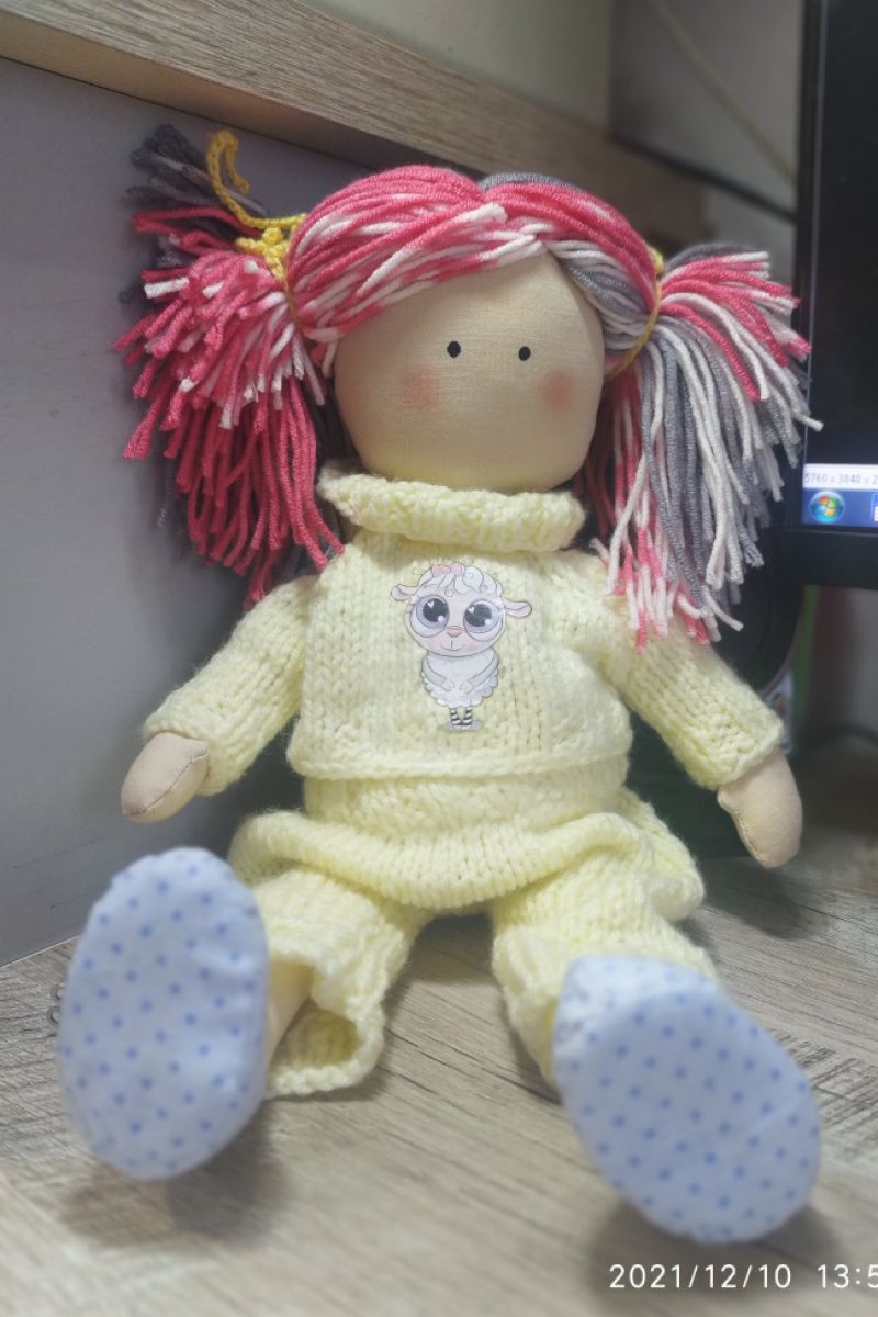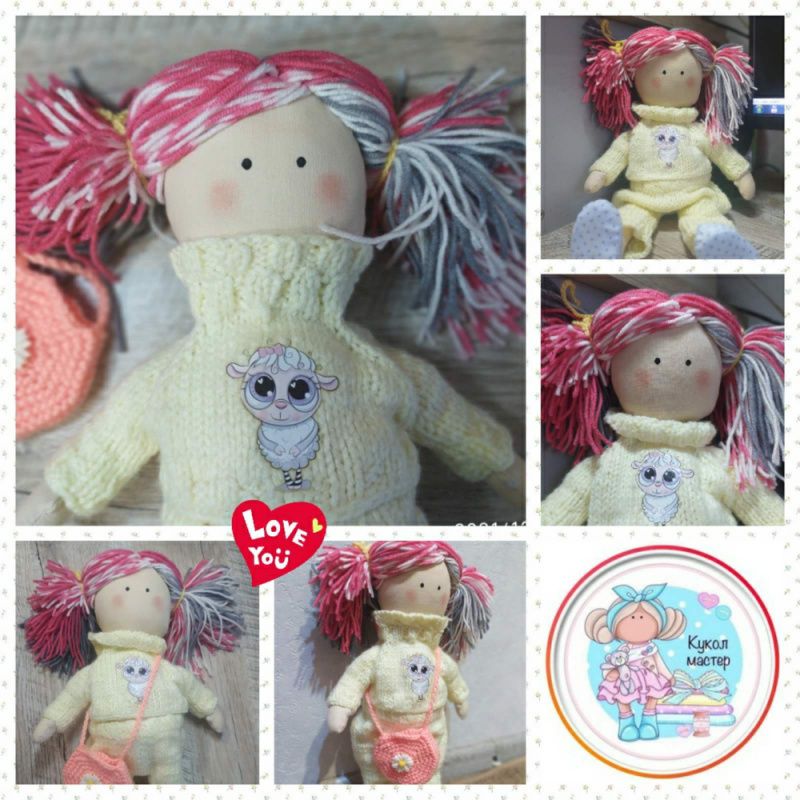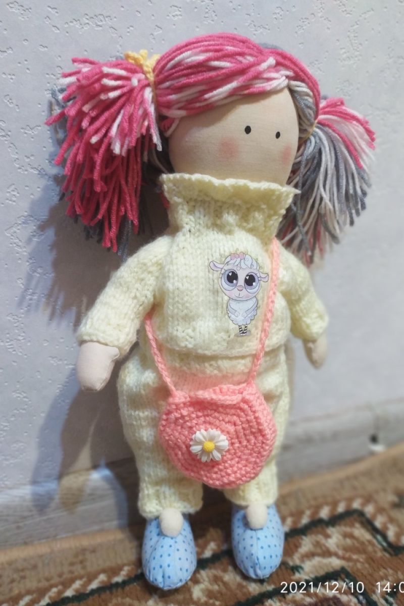 Очень милая кукла в жёлтом, вязаном костюмчике с принтом ′барашка′. Сумочка розовая с ромашкой - вязаная. Одежда не снимается. Рост - 34 см. Волосы - нитки.