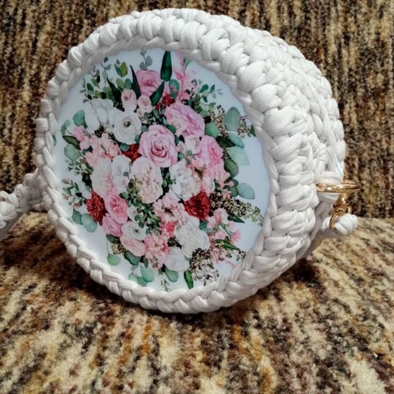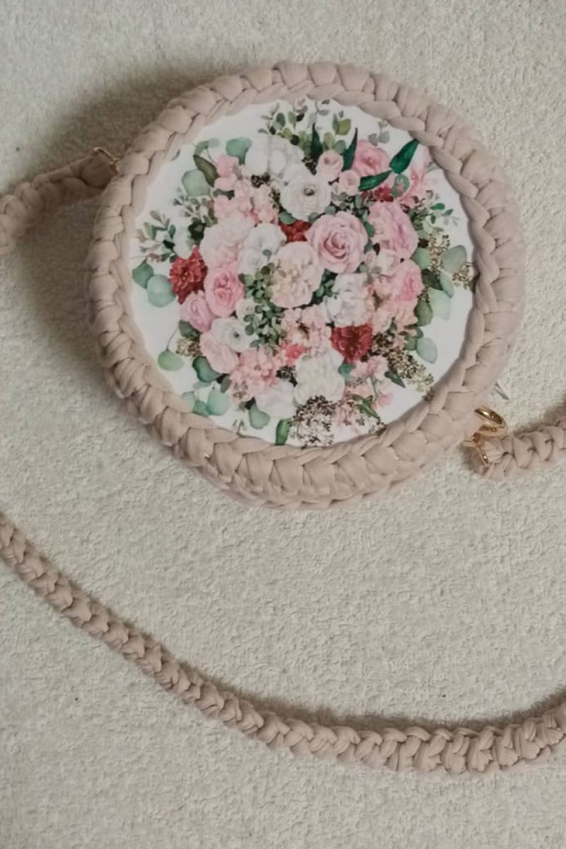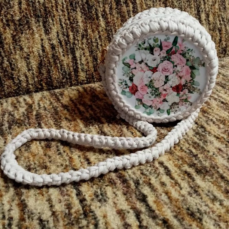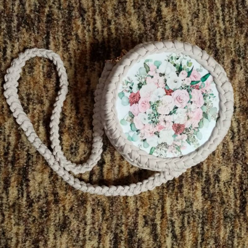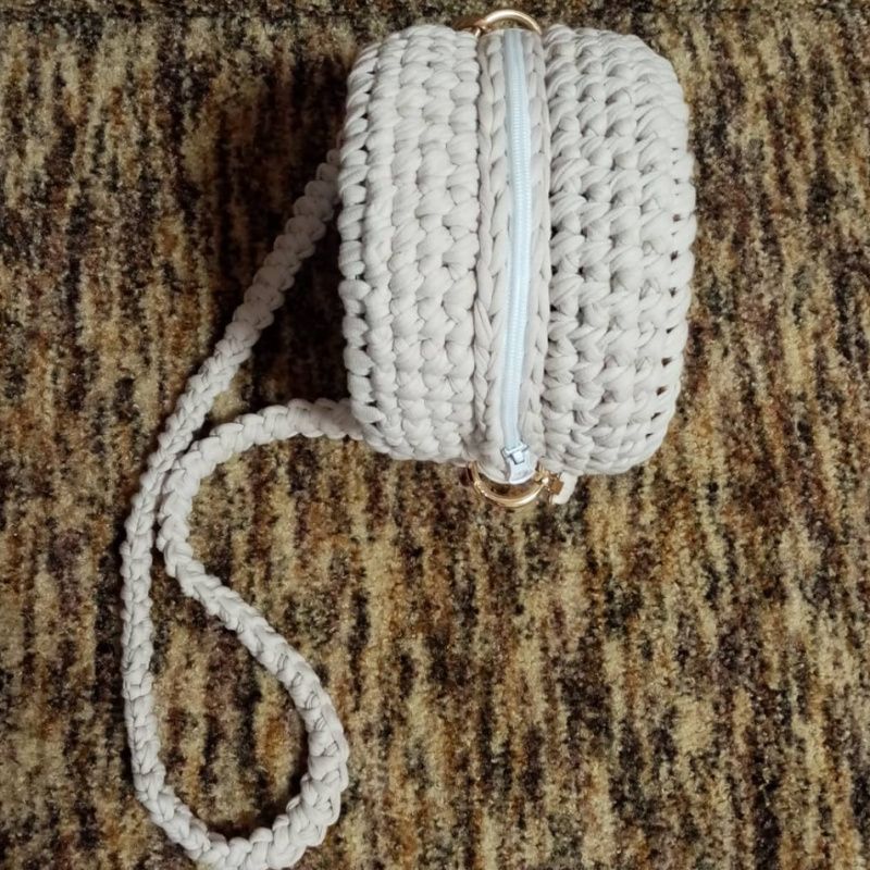 Сумочка вязаная крючком из трикотажной пряжи. Цвет : пудра. Диаметр 17 см, ширина 12 см