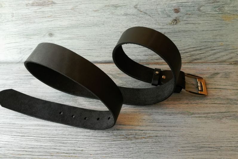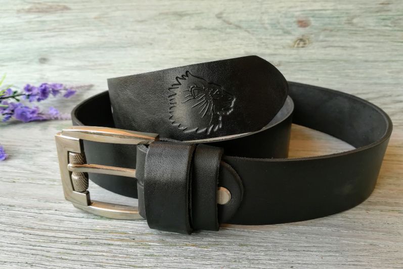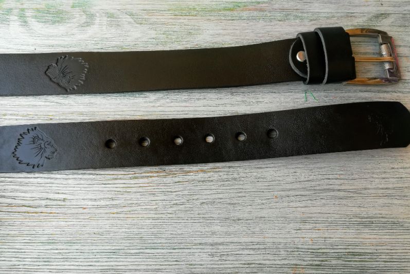 Ремень изготовлен из ременной кожи шириной 3,7 см, длиной 111 см, черного цвета с бронзовой пряжкой, украшен оригинальным тиснением. Он не склеен и не сшит, а изготовлен из цельного куска высококачественной натуральной кожи. Длина ремня просто регулируется самостоятельно под Ваш размер.