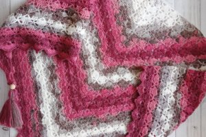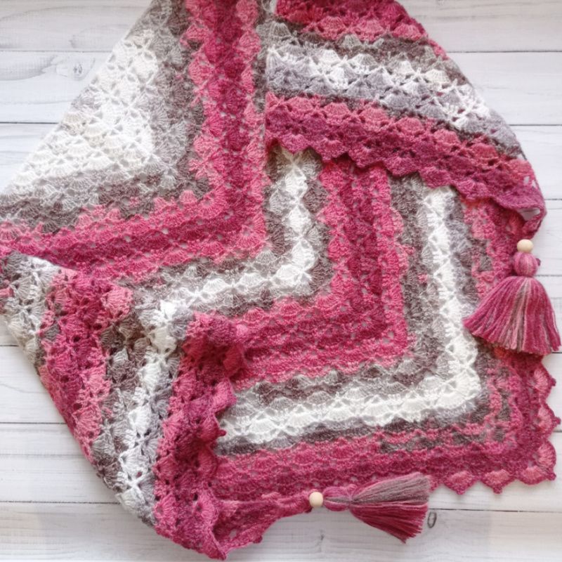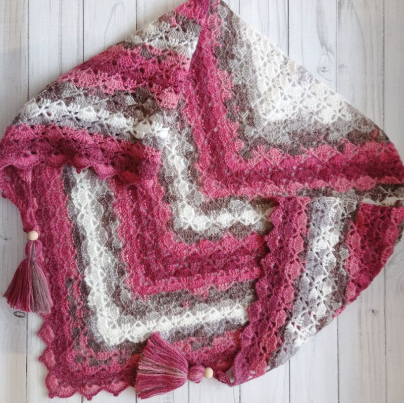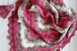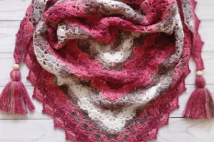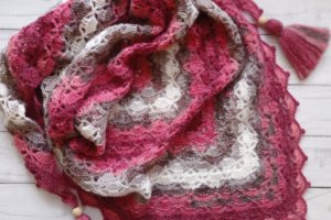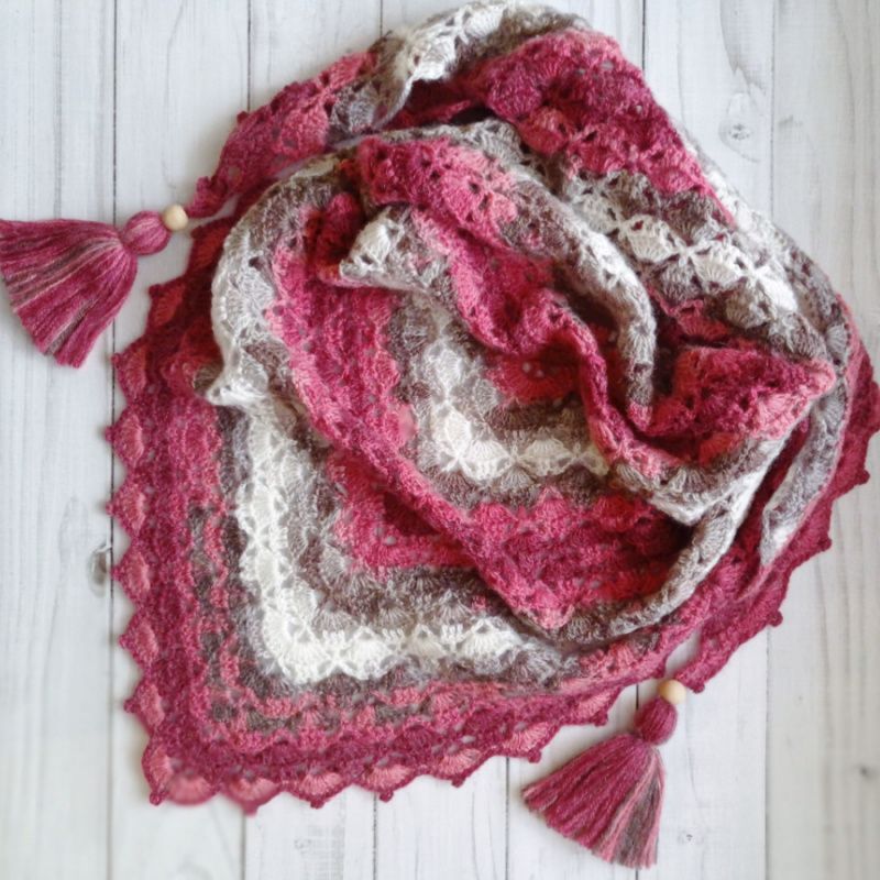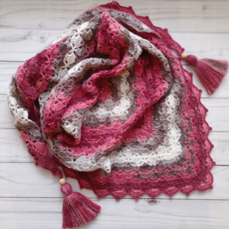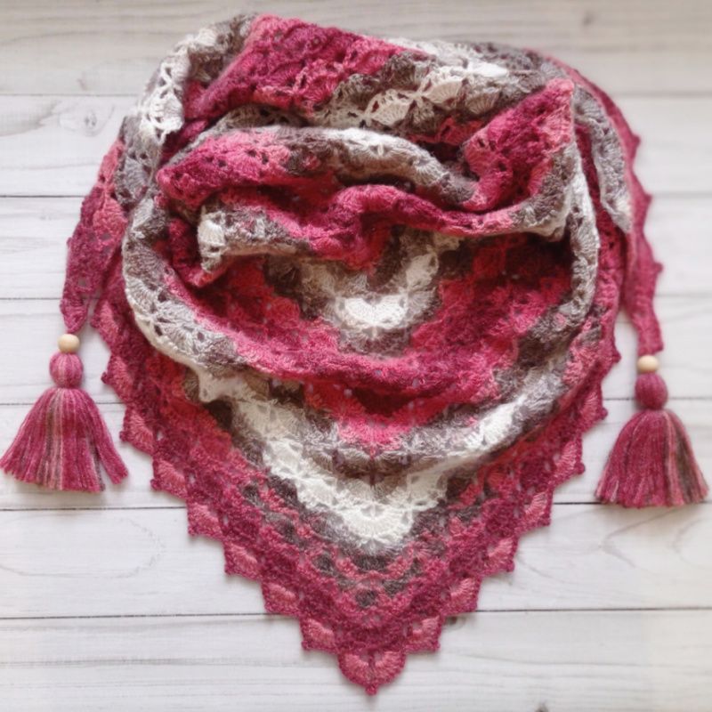 Этот изысканный бактус связан крючком из пряжи секционного крашения в красивом сочетании цветов - теплый белый,бежево-коричневые тона,красно-коралловые оттенки.