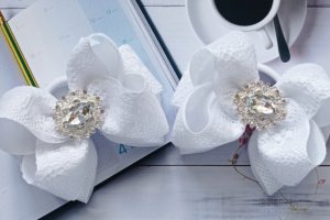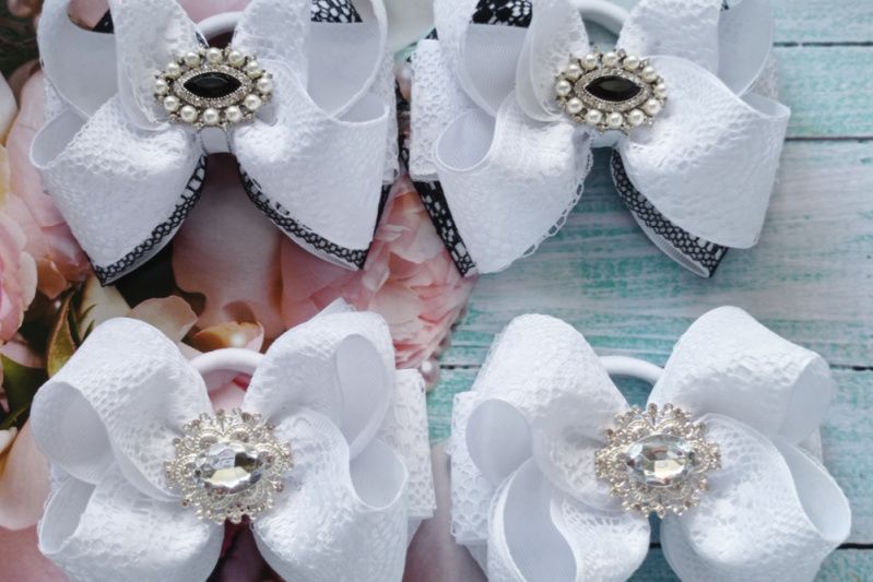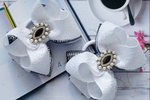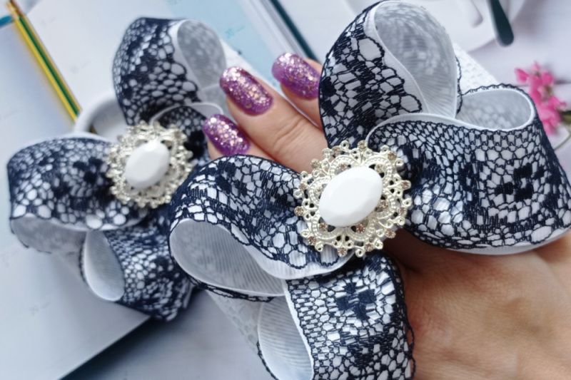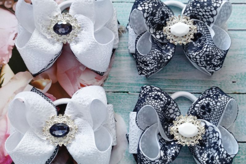 Объемные бантики из репсовых лент и кружева в белом,сине-белом и черно-белом цвете.