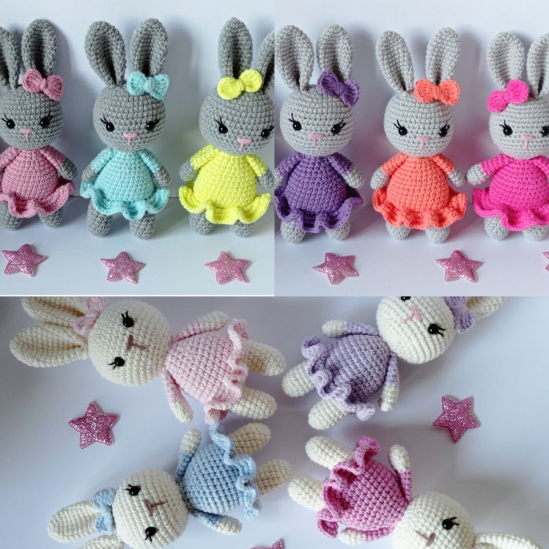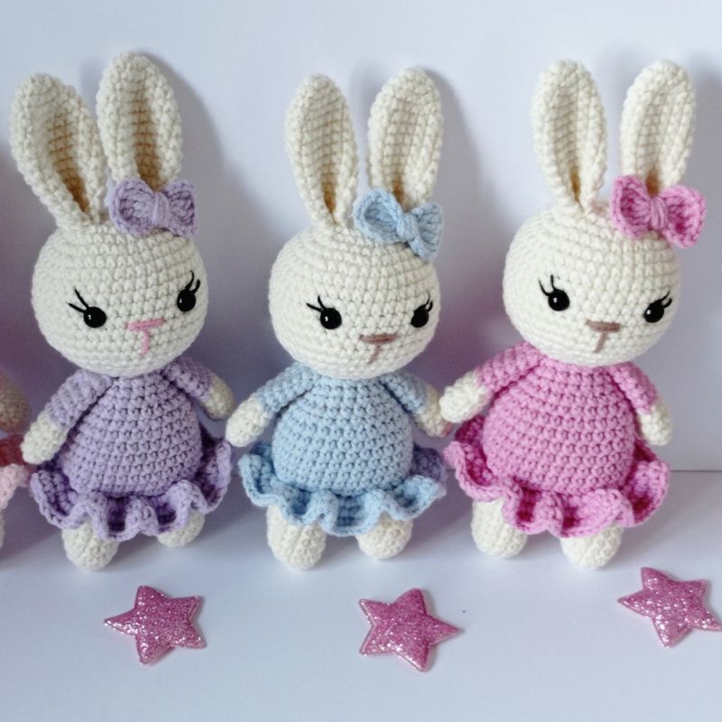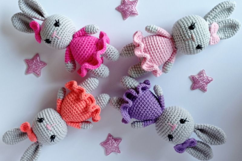 Милая игрушка Зайка в платье, размер 16 см, выполнена из пряжи Джинс, состав 55% хлопок. Наполнитель холлофайбер, глаза на безопасном креплении.