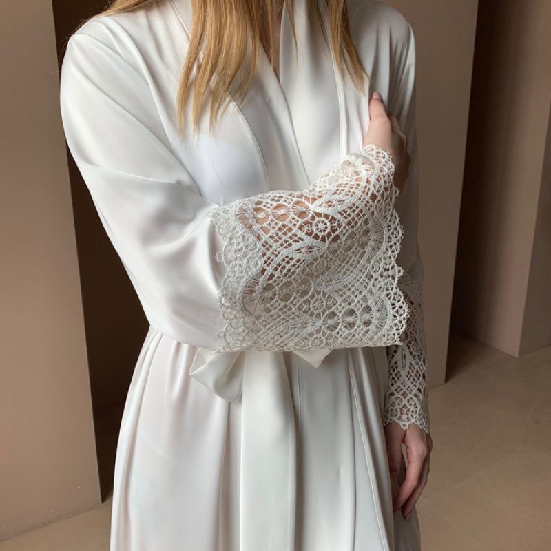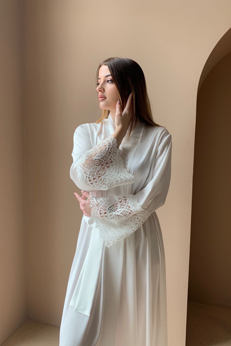Шелковый халат, цвет ейвори. Рукава отделаны кружевом макраме.