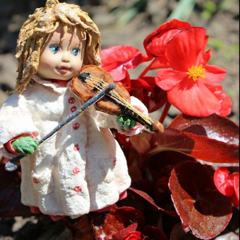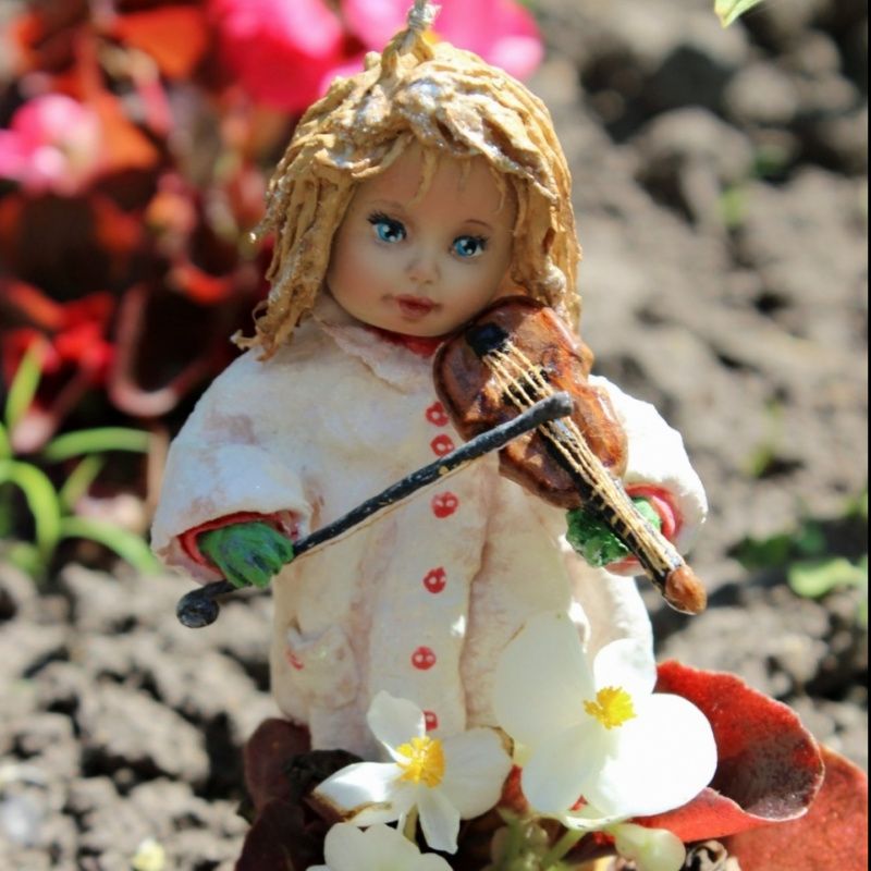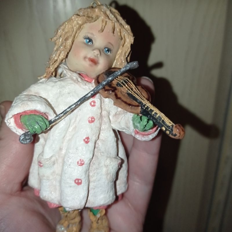 Миниатюрная куколка полностью ручной работы. Игрушка сделана из ваты и полимерной глины. Роспись акриловыми красками. При покрытии использовались различные лаки: акриловый, 3D и др. Очень прочная, но при этом лёгкая. Можно использовать и как новогоднее украшение и как сувенир.