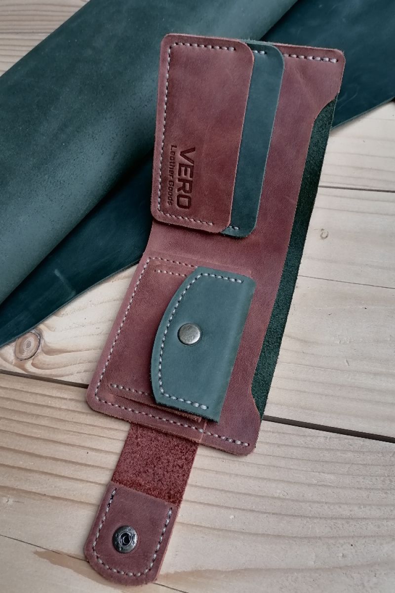 Кошелек выполнен из качественной натуральной кожи. 100% ручной работы. Приятная на ощупь натуральная кожа Crazy Horse. Прошит вручную крепкой вощеной нитью. Поэтому изделие прочно и долговечно и прослужит своему владельцу не один год. Размер: 9.5*11.5 см