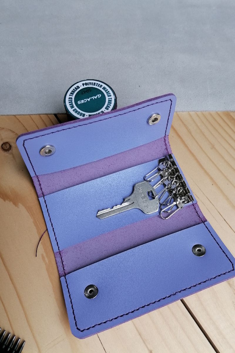 Ключница из натуральной кожи. Ручная работа. Прошита вручную крепкой вощеной нитью. Размер: 13*6.5 см. Может комплектоваться четырьмя или шестью карабинами. Возможно изготовление в других цветах и нанесение именной гравировки (бесплатно).