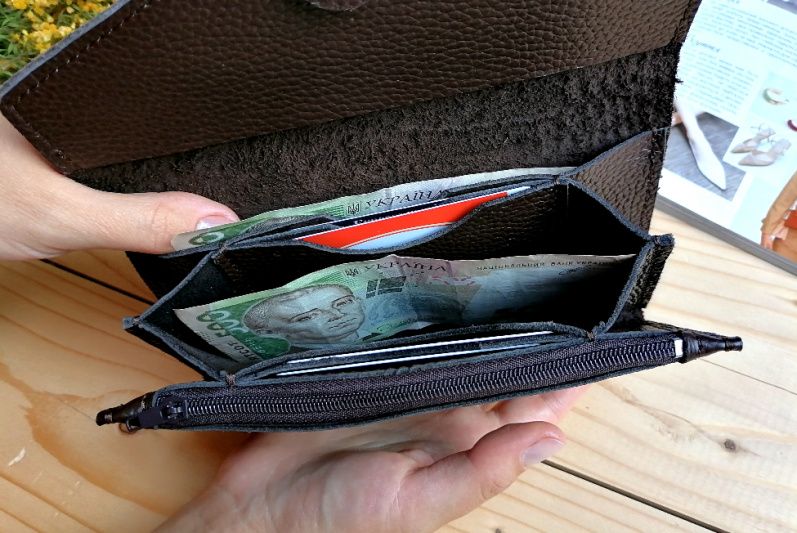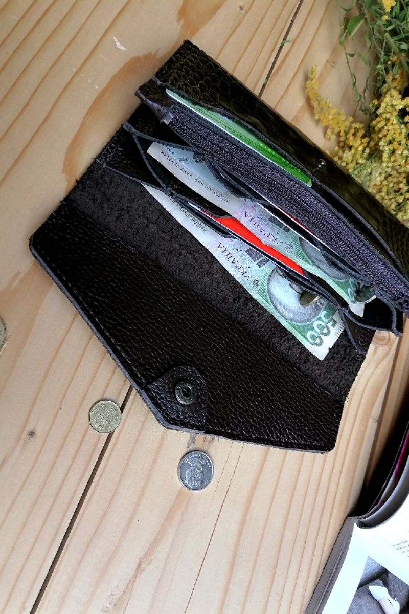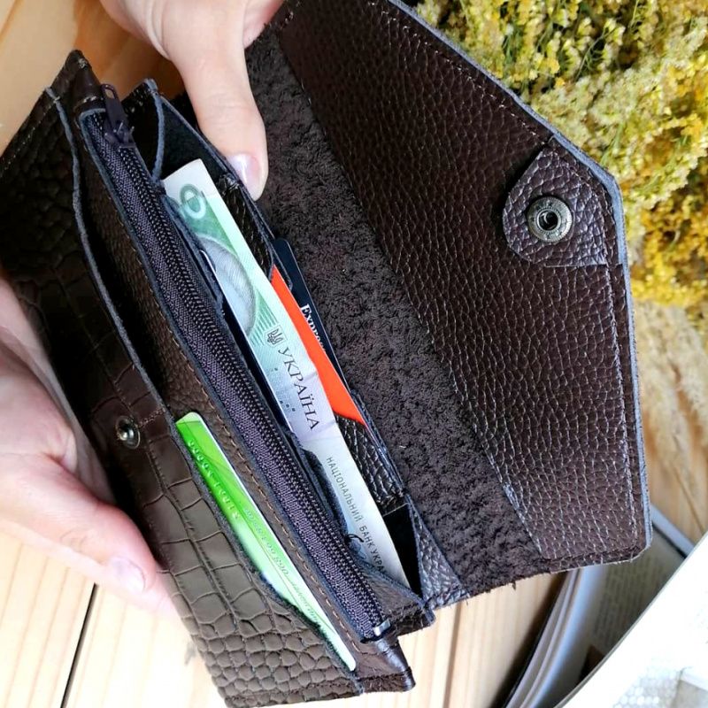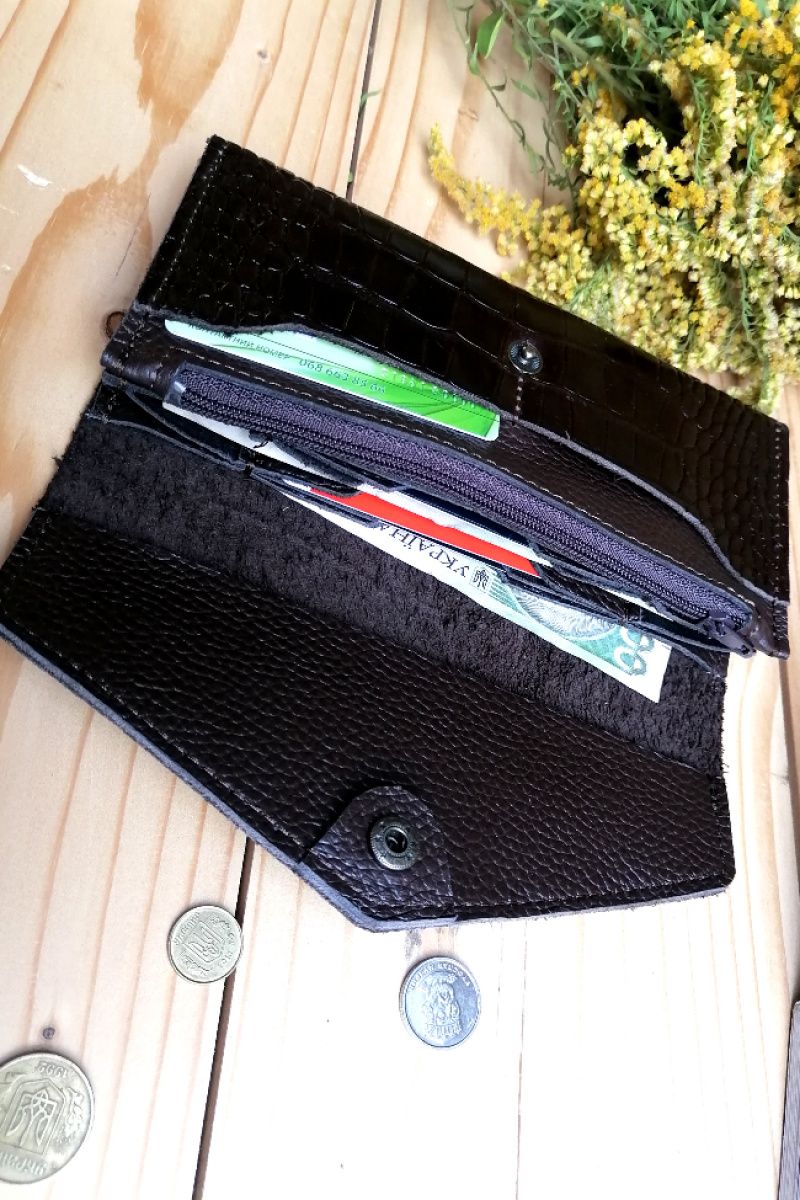 Стильный и вместительная женский кошелек из натуральной кожи. Имеет два больших отделения под купьюры, 8 карманов под карты и одно большое отделение на молнии под монеты. Возможно изготовление в другом цвете. Размер: 19.5 * 10.5 см