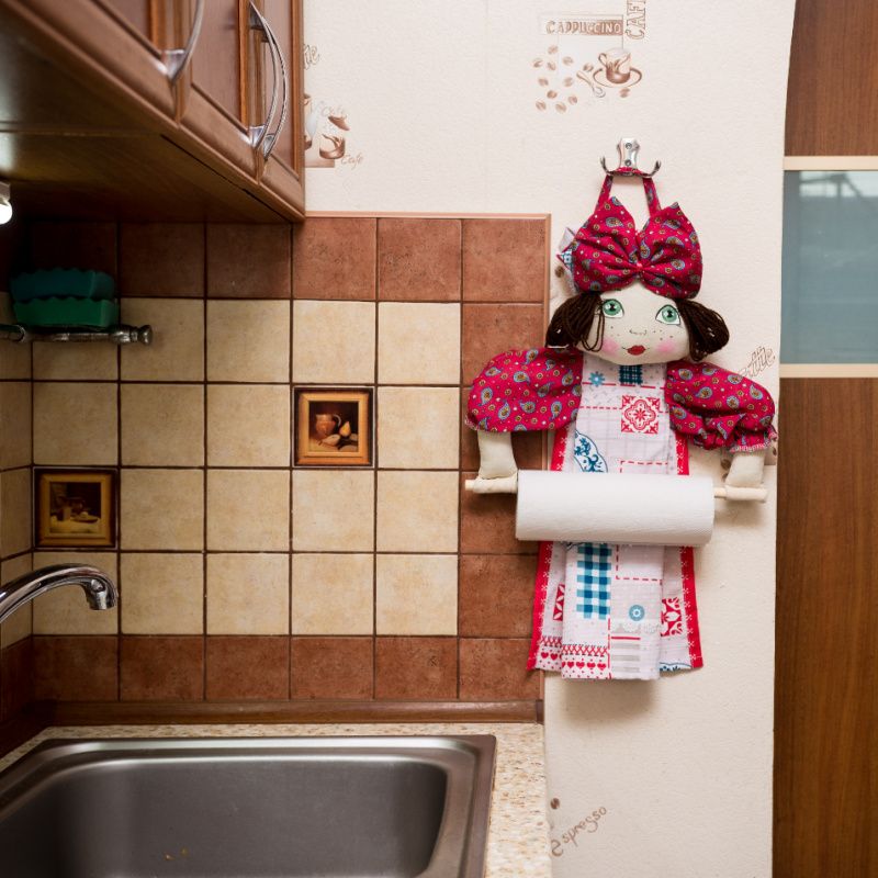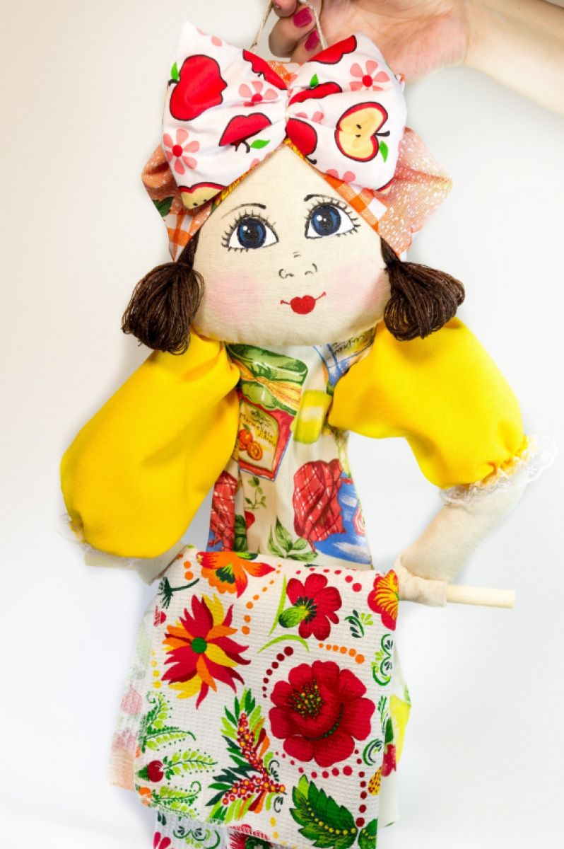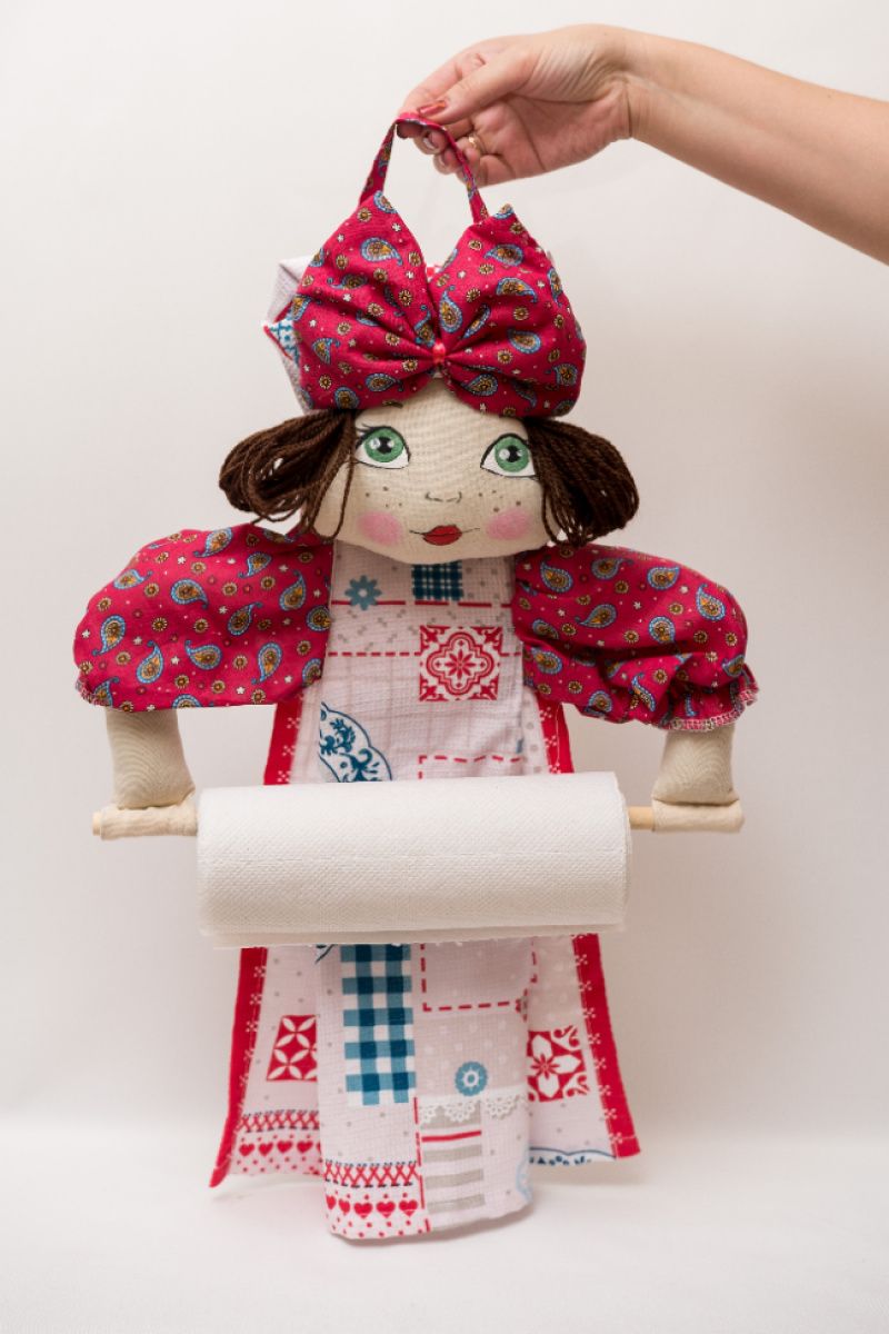 Декоративный держатель для полотенец или туалетной бумаги изготовлен в виде текстильной игрушки-держателя.