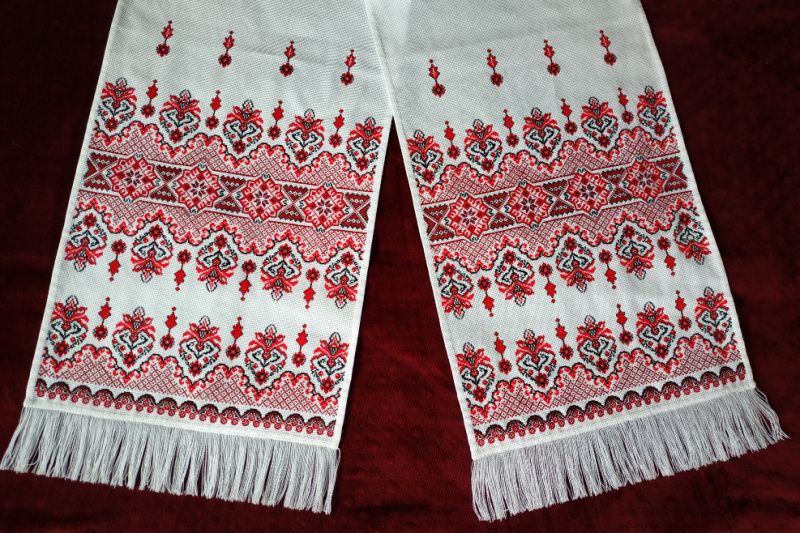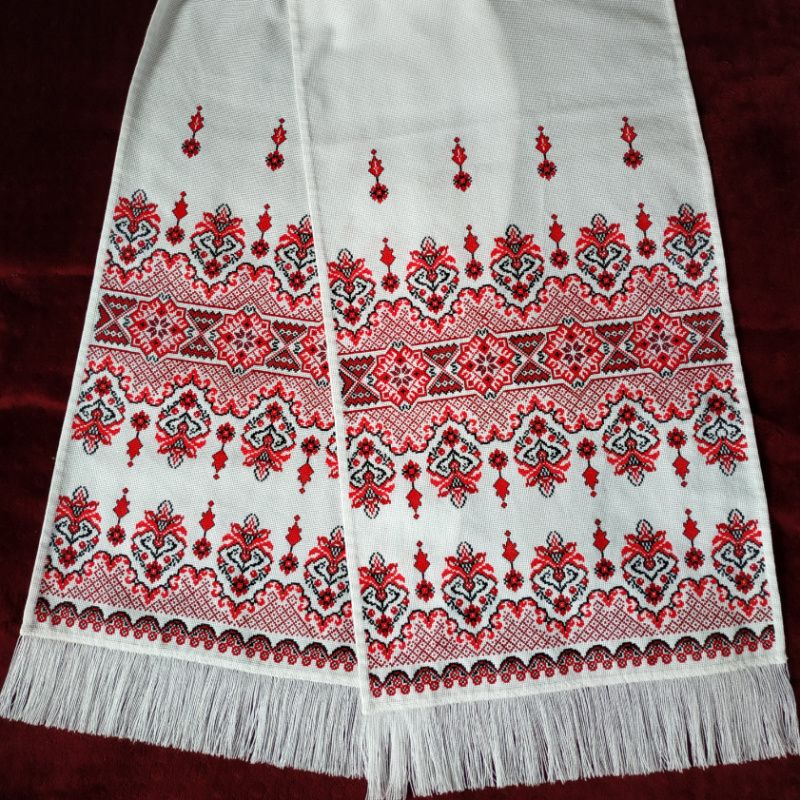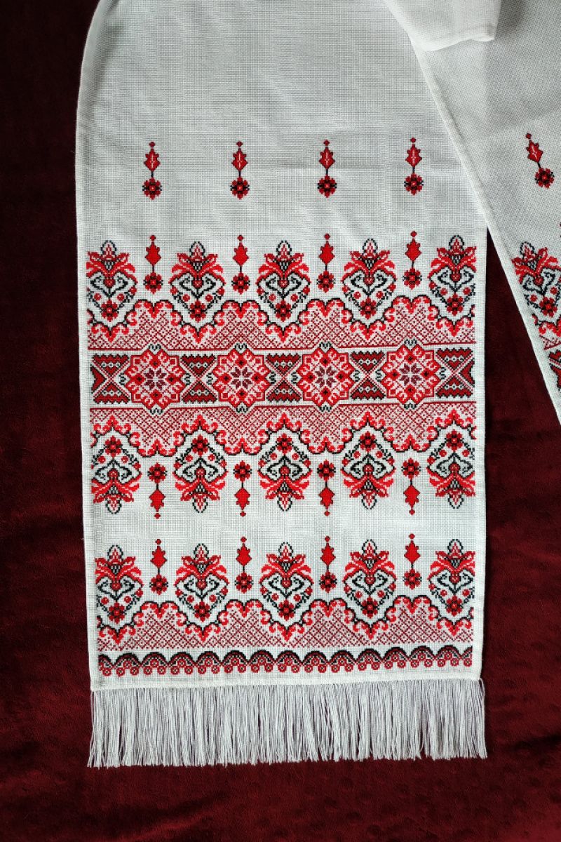 Полотенце продан. Возможно изготовление на заказ (срок 2 мес). Перед оформлением заказа - обязательно пишите, для обсуждения деталей. Очень красивый полотенце. Полностью ручная работа Вышитая на канве нитками красного (3 оттенка) и черного цвета. Подойдет как для свадебной церемонии так и украсить иконы в домашнем интерьере. Размеры: длина - 203 см ширина - 35 см высота вышитого узора - 47 см