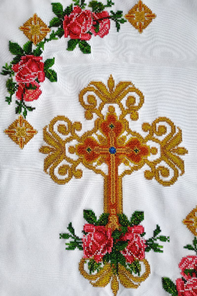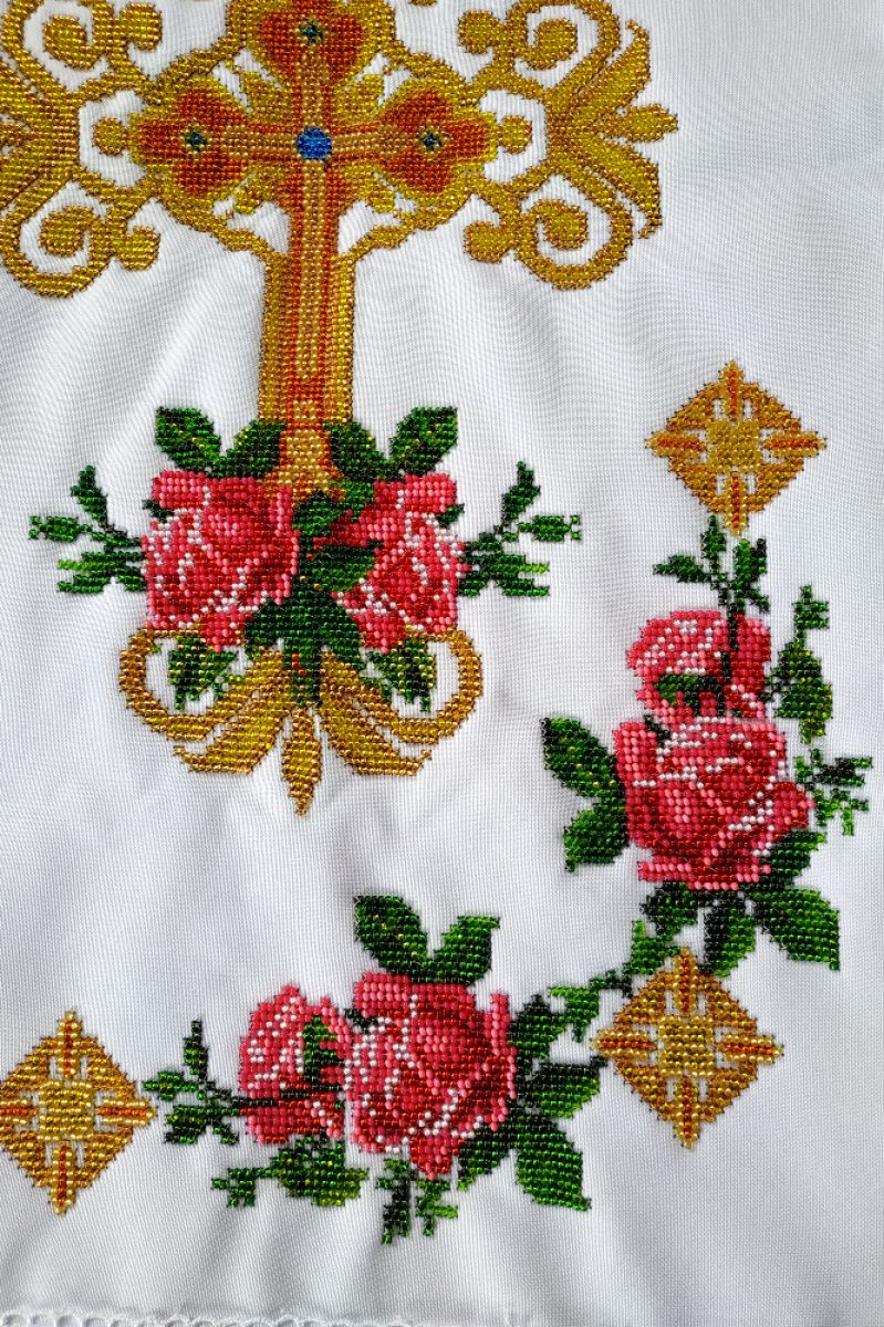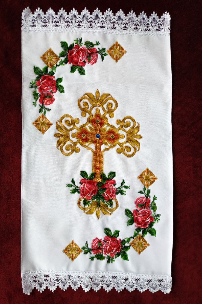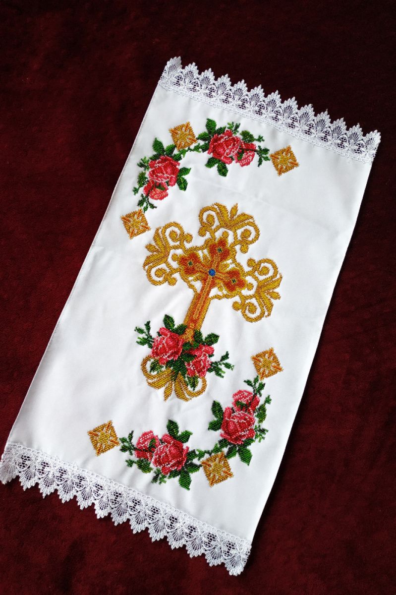 Очень хорошее полотенце ручной работы. Оригинально украсит вашу пасхальную корзину и пасхальный стол. Полотенце вышитое качественным ярким чешским бисером. Полностью ручная вышивка. Вышитый аккуратно и с любовью. На обороте подшит подкладкой. Украшен кружевом. Длина – 65,5 см, Ширина – 35 см.