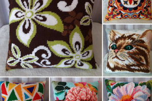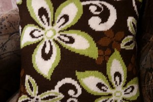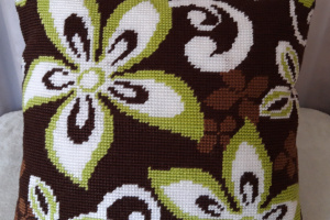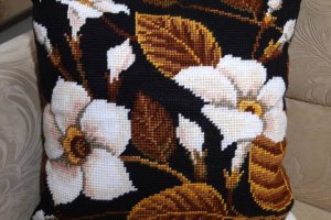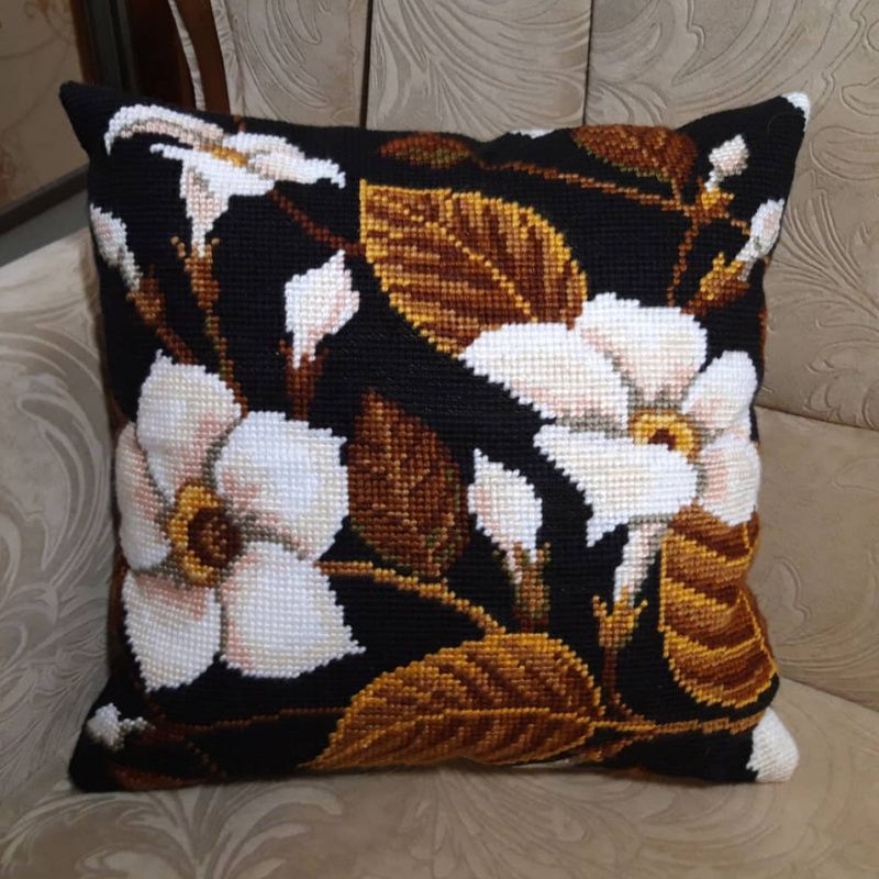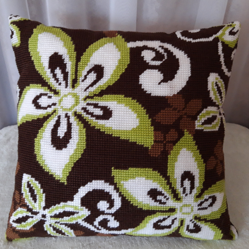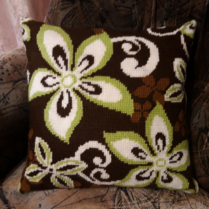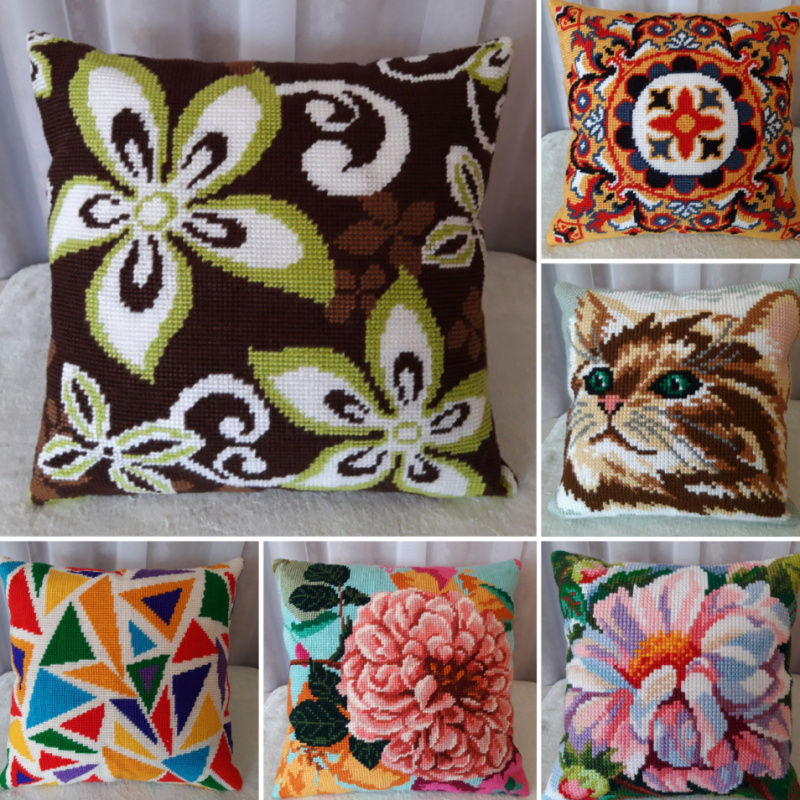 Вышитая декоративная подушка полукрестом, акриловыми нитями,