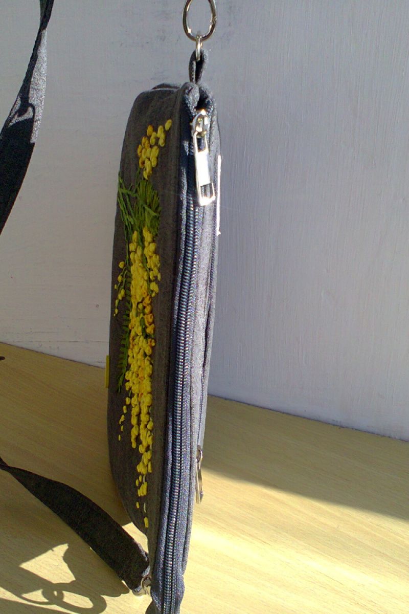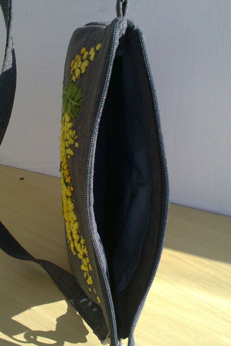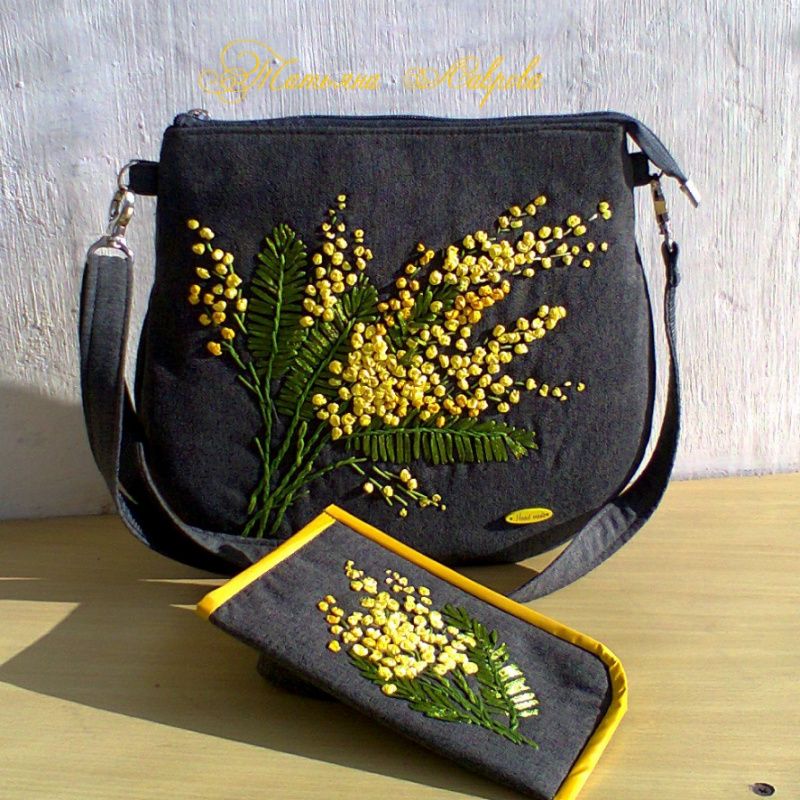 Сумка с вышивкой лентами. Ткань – рогожка, имеет одно отделение и 3 кармашка. Подклад из прорезиненной ткани.