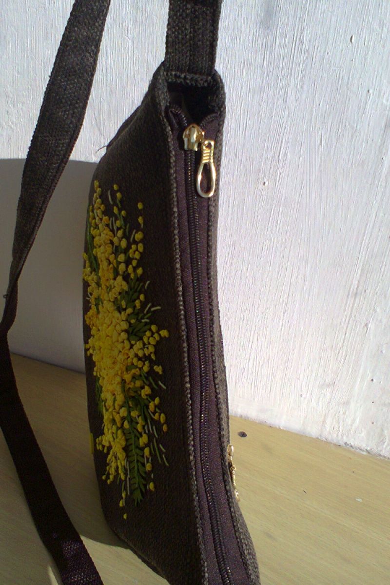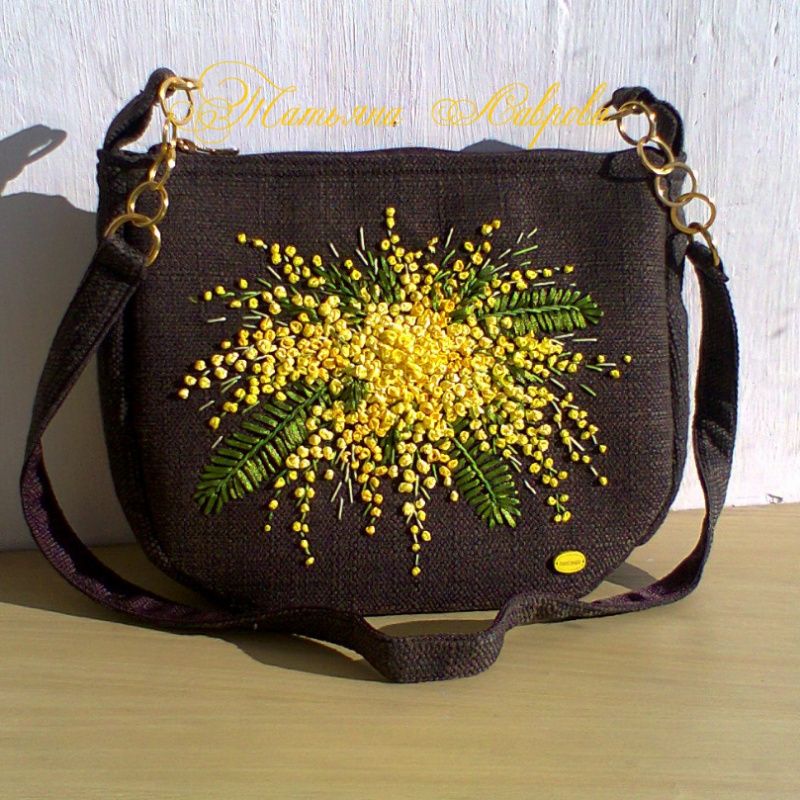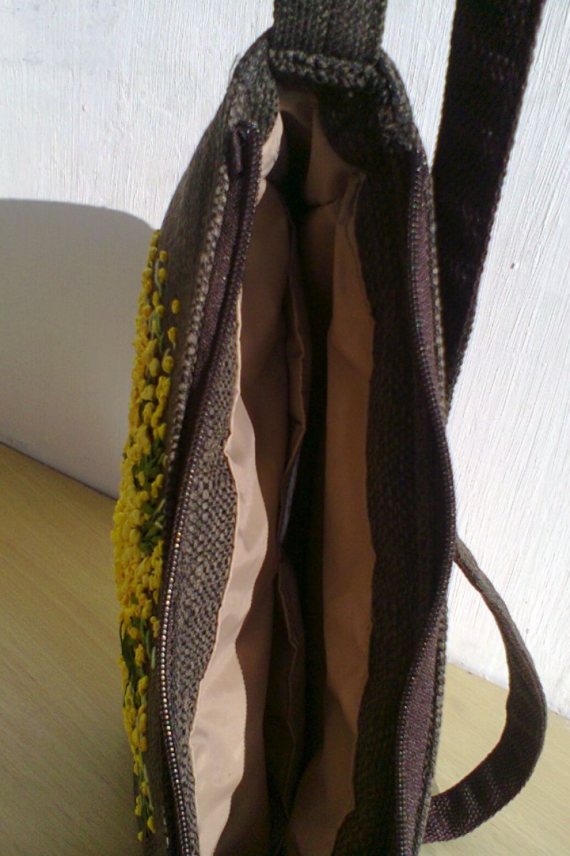 Сумка из рогожки с вышивкой лентами. Имеет одно отделение и три кармашка. Подклад из прорезиненной ткани.
