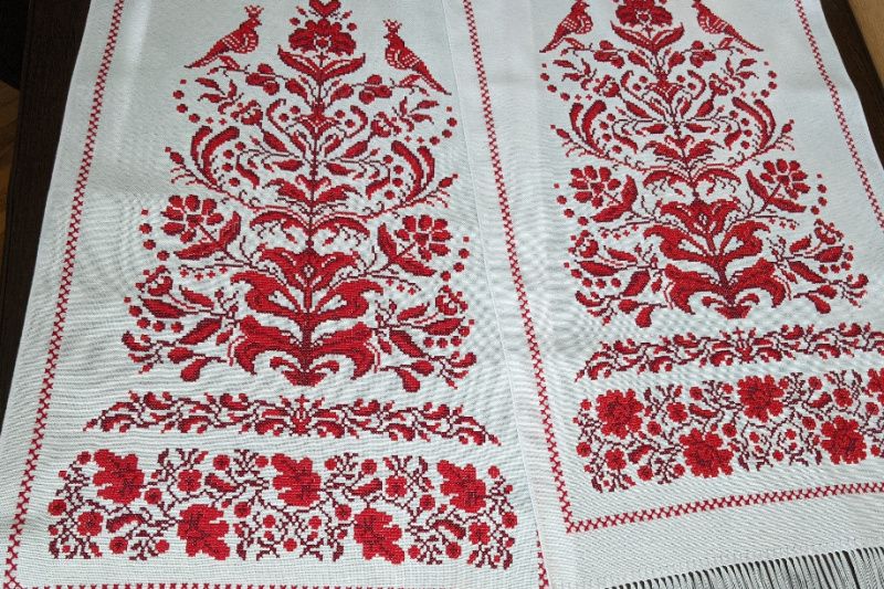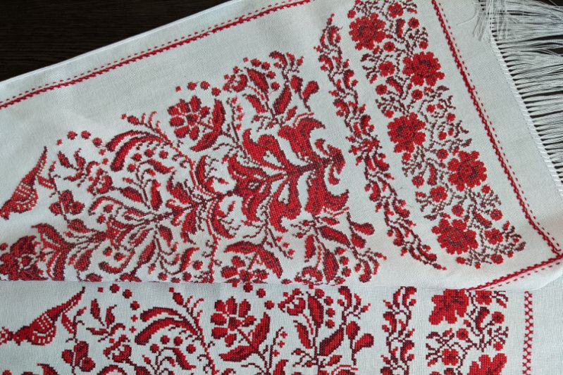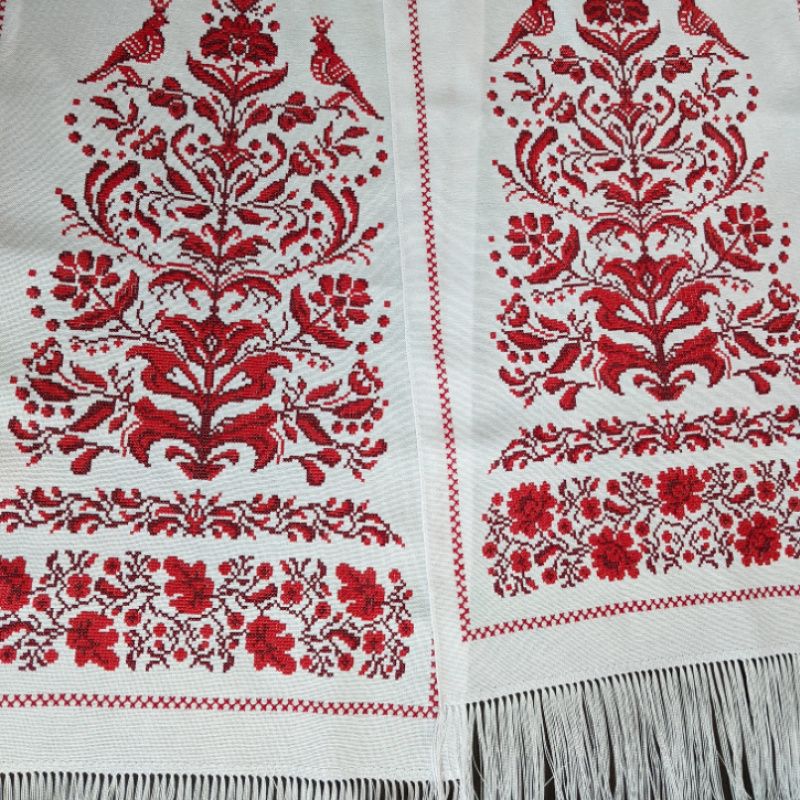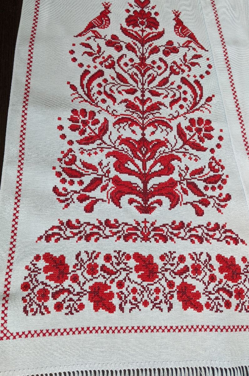 Свадебное полотенце с украинской вышивкой является едва ли не самым главным атрибутом венчания. Символика Деревья жизни воспеты в поверьях и легендах Украины. Для узора на полотенце часто выбирают «дерево жизни» – символ крепкой семьи, продолжение рода, счастливой семейной жизни. Именно этот узор выбрала я для создания самого главного свадебного полотенца под ноги, на котором становятся молодожены. Свадебное полотенце имеет женскую и мужскую части. Первой вышивают правую, мужскую, часть полотенца. Я на мужской стороне вышила дубовые листочки (дуб – символ мужской силы, жизни и развития). На женской части – цветы роз с бутонами. Если вышить розу в сочетании с листочком, то получается композиция триединства – рождение, развитие и непрерывность жизни. Женщине важно не только самой преуспевать, но и продолжать свой род. Поэтому у роз еще вышила бутоны. Вышивка дополняется бесконечником, который вышивается по краю полотенца. Основное требование – непрерывность орнамента из конца в конец, чтобы не прерывалась жизненная дорога молодоженов. Свадебное полотенце под ноги Обрядовое – это сочетание машинной вышивки и ручной работы. Каждый крестик, как бисеринка, такой вид вышивки имеет за счет использования водорастворимого стабилизатора и вышивания. Окончание полотенца - кисти ручной работы. По длине полотенца вышитая отделка красного цвета (бесконечник). Эта вышивка крестиком выполнена вручную и придает изделию не только завершенность и дополнительную торжественность, но и несет в себе мощное сакральное значение. Размер полотенца 245*40 см. Такой размер совсем не случаен, ведь опытные вышивальщицы уверены, что длина полотенца должна делиться на семь. Поэтому при вышивке свадебного рушника Обрядовый я соблюдала все народные традиции. Ваше вышитое полотенце – это особое сакральное действо, ваш собственный вклад в будущее своей семьи, оберег вашей счастливой супружеской жизни.