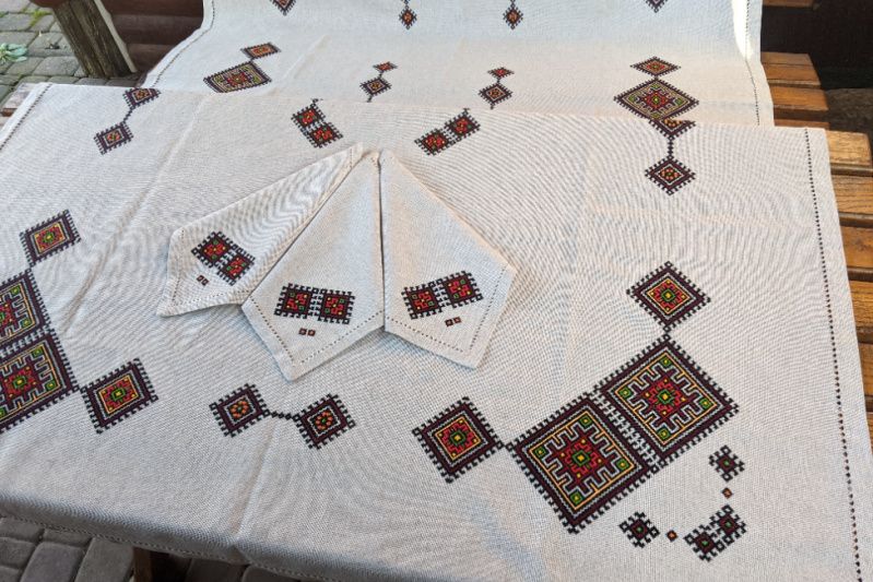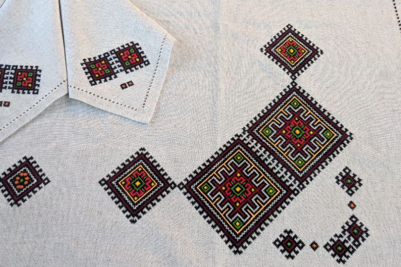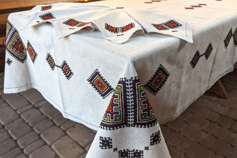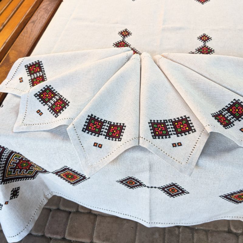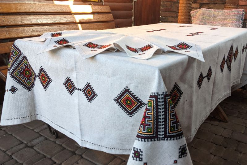 Вышитая скатерть Этно в украинском стиле украшена ручной вышивкой одного из древнейших символов славян – ромба. Орнаменты с ромбами были сильным защитным оберегом, приносившим успех. Согласно архаической культуре, ромбы представляют богиню Земли, олицетворяющую плодородие. Ручная вышивка изделия выполнена с помощью древней техники – низинка или так называемая гуцульская низ, также некоторые элементы выполнены гладью. Основной характерной особенностью низменности является то, что вышивка производится с изнаночной стороны. Такая техника низменности создает очень выразительный рисунок, одинаково привлекательно выглядящий вышитая скатерть с разных сторон. Вышивка низинкой относится к одной из древнейших. Пропуская через нити нить контрастного цвета, вышивальщица буквально тчет новый узор. С лицевой стороны получаем один рисунок, с другой – его негатив. Яркая и красочная лицевая сторона и безупречный выворот скатерти ручной работы является характерным признаком мастерства. Качественное льняное полотно для ручной вышивки, на котором создана скатерть, белорусского производства. Содержит в своем составе лен, хлопок и лавсан. Небольшое количество синтетической нити позволяет легко и быстро стирать скатерть даже в стиральной машине. Глажка с использованием пара придает скатерти аккуратный вид, а также помогает держать форму. Размер скатерти 240*140 см, как раз для стола на 6-8 человек. К скатерти добавляется 6 вышитых салфеток ручной работы, создающих яркий набор в этническом стиле.