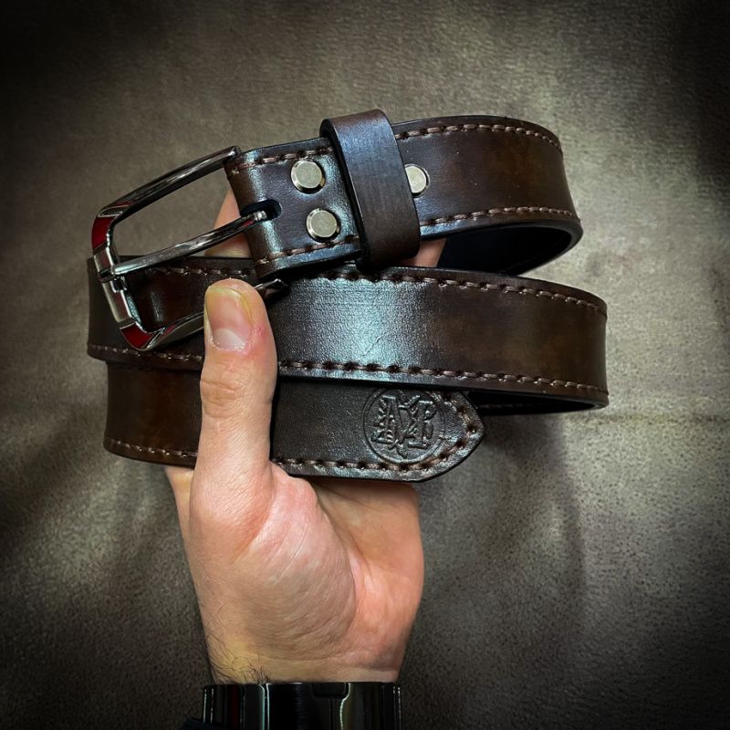 Мужские ремни из натуральной кожи ручной работы с эффектом патины. Прекрасный подарок для себя или любимого человека. Ремень из кожи растительного дубления, окрашенный и прошитый вручную седельным швом, который считается намного прочнее машинного. Прошивка обеспечивает армирование ремня, что в свою очередь уменьшает растяжение ремня при использовании. Ремень получился достаточно плотный, толщина кожи около 4-4.2мм. Цвет – коричневый, ширина – 35мм, длина: 120 см.