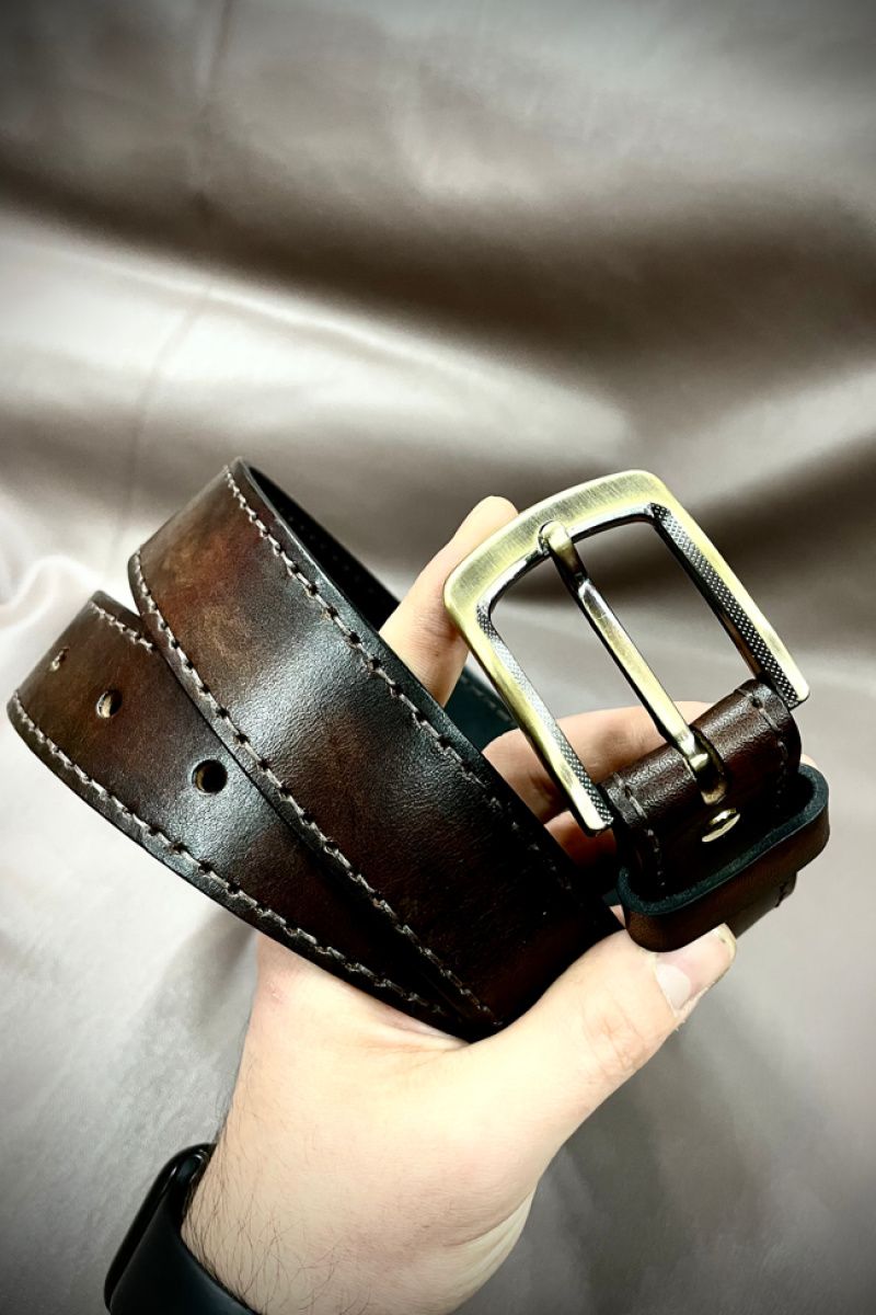 Мужские ремни из натуральной кожи ручной работы. Прекрасный подарок для себя или любимого человека. Ремень из кожи растительного дубления, окрашенный и прошитый вручную седельным швом, который считается намного прочнее машинного. Прошивка обеспечивает армирование ремня, что в свою очередь уменьшает растяжение ремня при использовании. Цвет – коричневый, ширина – 35мм, длина: 115 см.