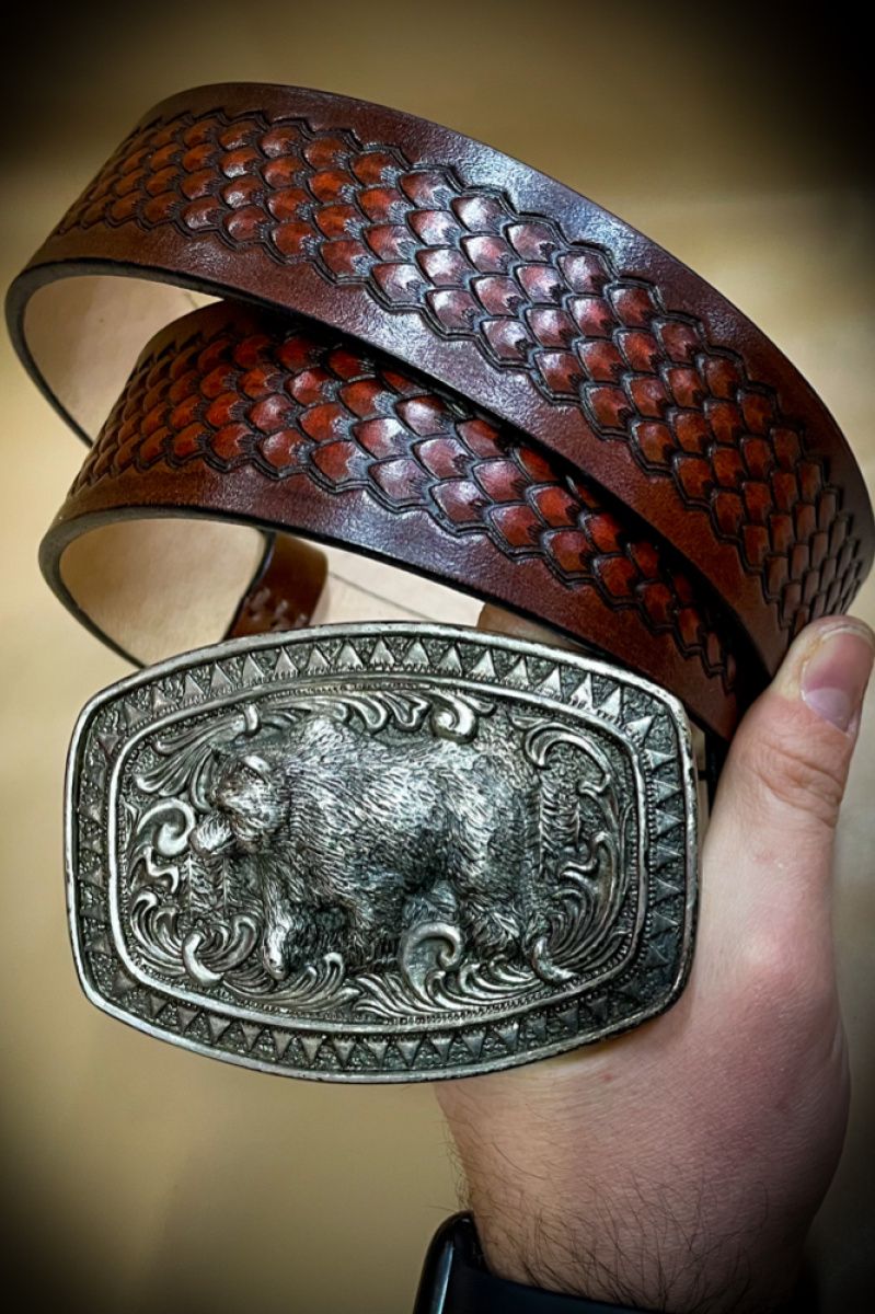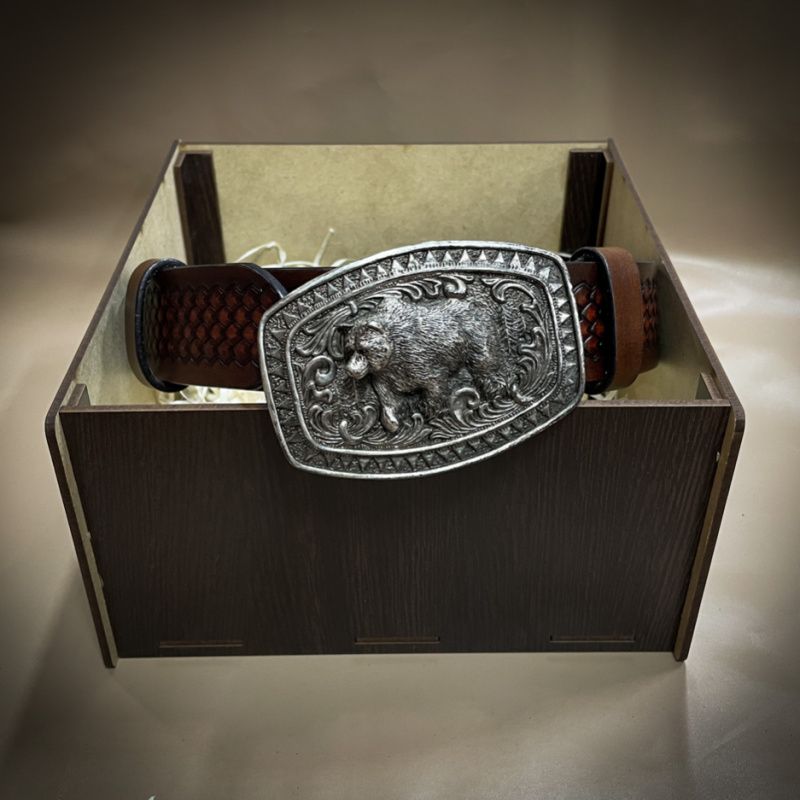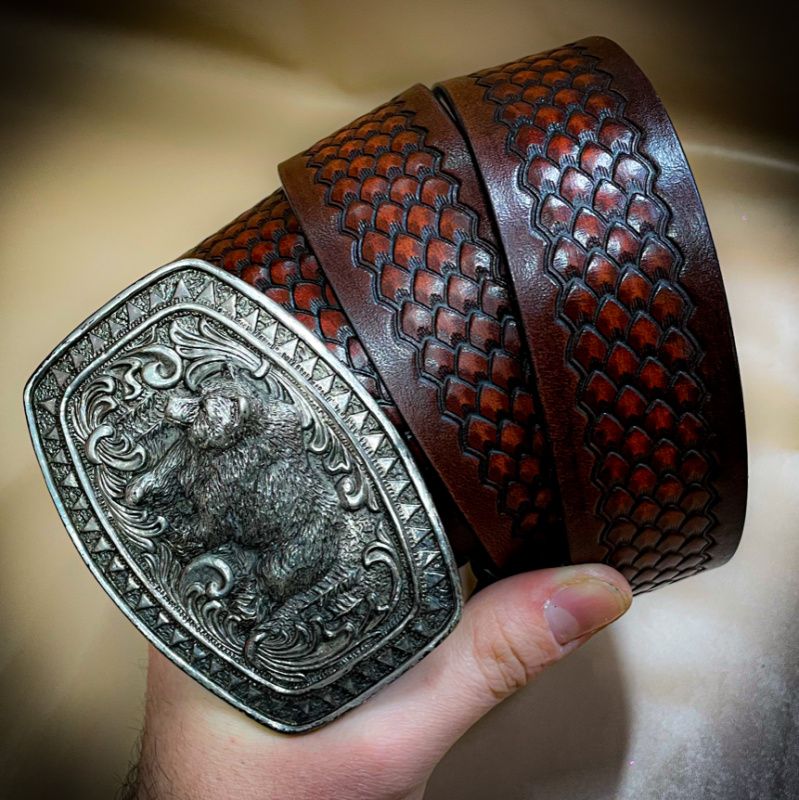 Кожаный ремень с тиснением и 3D пряжкой, изготовлен и окрашен вручную. Ремень выполнен из кожи растительного дубления итальянского производства. Пряжка выполнена из нержавеющей стали с элементами чернения, стариения и ковки. Размеры пряжки - 68х94мм, вес-155 г. Сама кожа окрашена вручную, цвет коричневый с бордовым оттенком. Задняя часть закатана и обработана воском для лучшего скольжения. Ширина ремня 38мм, длинна без пряжки 115 мм. Пряжку можно заменить на классическую или на одну из фото.