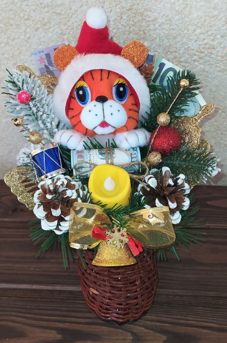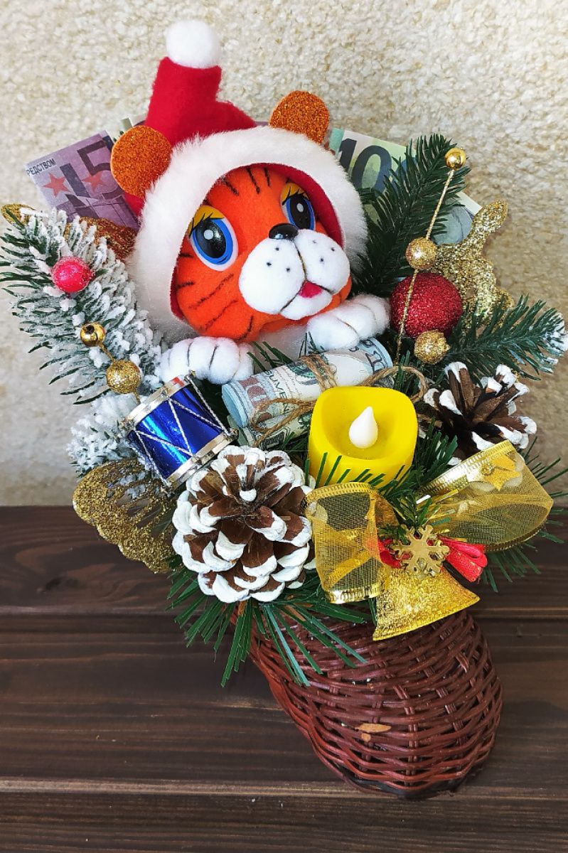 Тигр – символ 2022 года. Установлен в плетеном сапожке. Свеча на батарейке