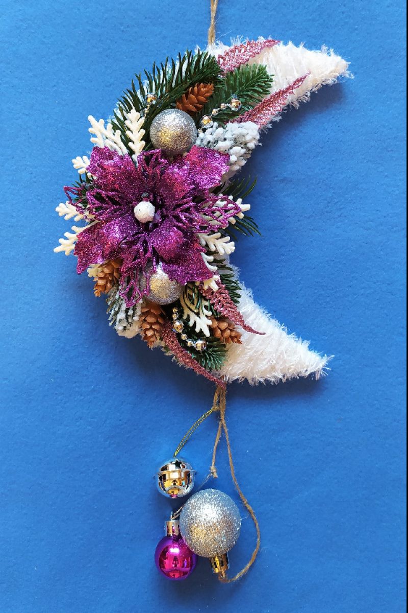 Оригинальная подвеска в виде Луны украшенной Рождественской звездой (цветок пуансетии) – отличный вариант новогоднего декора для себя или в подарок близким людям. Новогоднее украшение можно повесить как на дверь так и на стену – 22 см в диаметре, 40см общая длина. Прекрасно подойдут такие игрушки для новогоднего декора в классическом стиле, в стиле Эко, Прованс и других. Способ крепления – петелька.