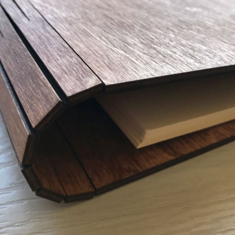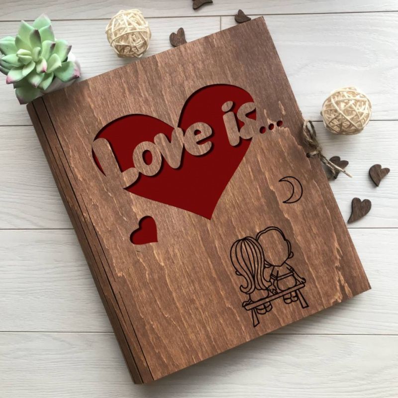 Оригинальное фотокнига из дерева «Love is» Мы создали дизайн деревянного альбома для фото с изображением силуэтов всем известной влюбленной парочки из знаменитой жвачки «Love is». Если Вы собирали в детстве эти милые вкладыши с цитатами, тогда наш новый вариант деревянной книги Вам точно понравится. Вы можете создать внутри этого необычного фотоальбома с дерева свою собственную романтическую историю. Все Ваши ценных воспоминания будут надежно храниться под милой обложкой альбома из дерева. Альбом для фотографий изготовлен из натуральной березовой фанеры, а силуэты мальчика и девочки нанесены с использованием техники высокоточного лазерного гравирования. Универсальные письма, цвета слоновой кости позволяют клеить фото разного формата, делать подписи а также оставлять рисунки. Деревянные альбомы для фото и записей сейчас пользуются огромной популярностью, поскольку материал изделия долговечный в использовании и позволяет создавать различные варианты дизайнов. Поскольку мы являемся производителем деревянных альбомов, то можем внести любые изменения в дизайн обложки.