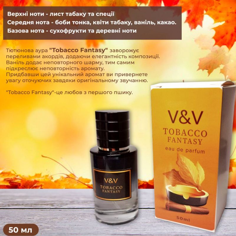 Табачная аура "Tobacco Fantasy" завораживает переливами аккордов, придавая элегантность композиции. Ваниль придает неповторимый шарм, тем самым подчеркивает неповторимость аромата. Приобретя этот уникальный аромат, вы привлечете внимание окружающих благодаря оригинальному звучанию. "Tobacco Fantasy" - это любовь из первого пшика. Верхние ноты - лист табака и специи Ноты сердца-бобы тонкая, цветы табака, ваниль, какао. Конечная нота-сухофрукты и древесные ноты