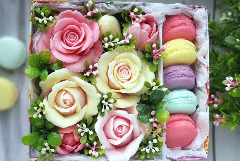 Чудовий подарунок до Дня Св. Валентина, 8 березня, Дня народження! Всі квіти та пирожки з справжнього мила. Композиція складається з 7 кольорів та 5 макарун, які є ароматним та ніжним мило. Є багато причин вибрати квіткову коробочку: Це оригінально і незвичайно. Такий подарунок безперечно викличе вау-ефект і запам'ятається надовго! • Квіти не зав'януть через пару днів, а радуватимуть своєю красою кілька років! • Це практично. Квітковою коробочкою можна прикрасити інтер'єр (ліжко, комод і т.д.) або використовувати мило за його прямим призначенням • Це ексклюзивний і унікальний подарунок! Розміри коробочки - 16,5 * 14,5 см Коробочка з кришкою! Вага мила в коробочці – 420 грам! Упаковка входить у вартість.