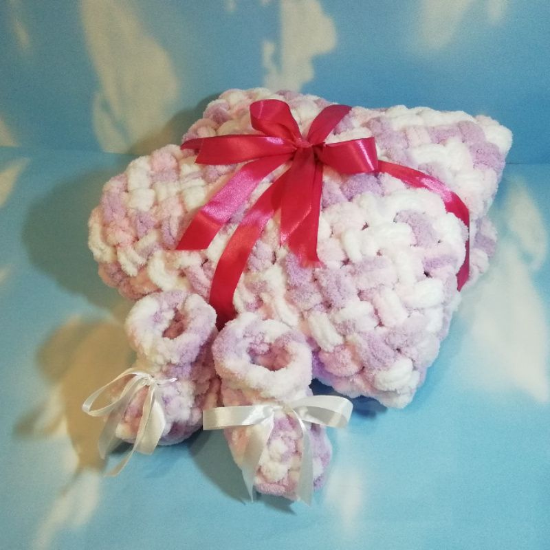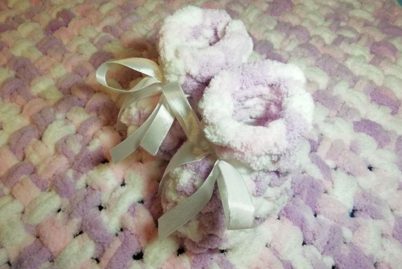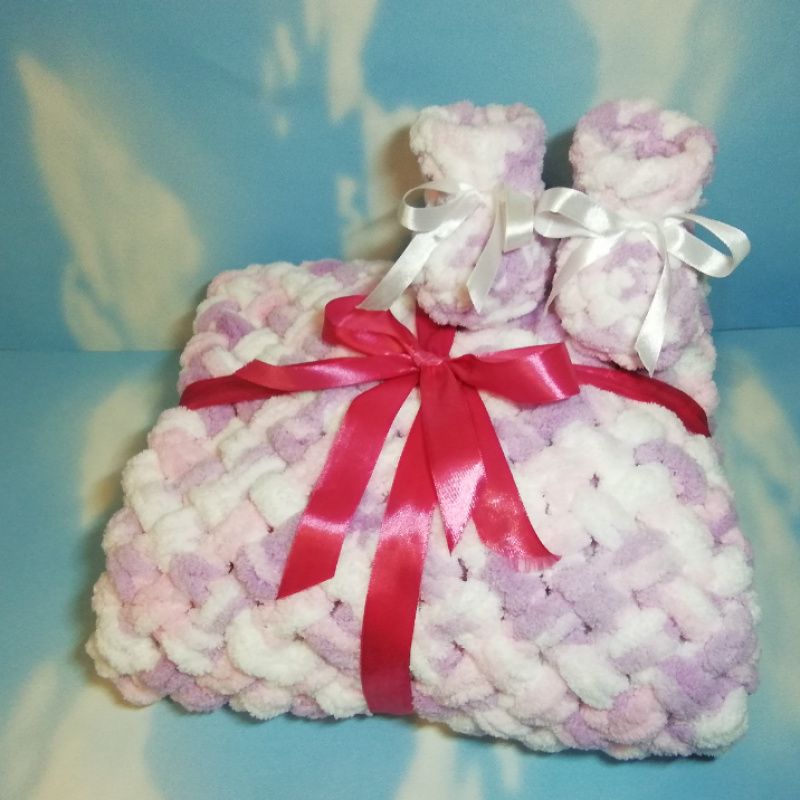 Отличный подарок для младенца. Невероятно нежный и приятный на ощупь. Гипоаллергенная нить alize puffy color 100% микрополиестер. Богатая цветовая гамма. Плед 80х80 см. Пинетки 9 см ступня. По заказу зплету нужного размера, выбранного вами цвета. Цена изделия указанных размеров.
