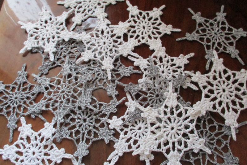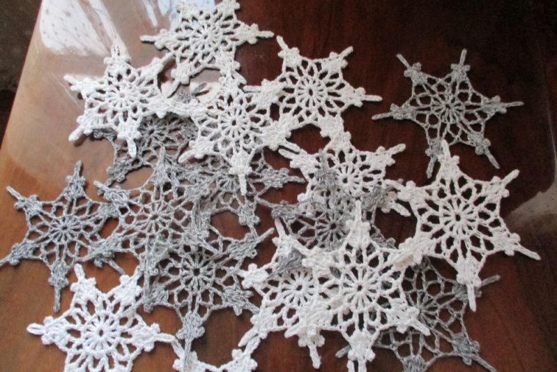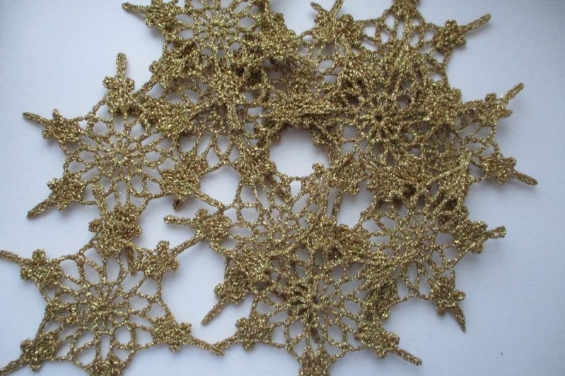 Снежинки связаны крючком. Диаметр 11- 13 см. Жёстко накрахмалены, петля из люрекса. .Материал: хлопок, хлопок с люрексом, хлопок с вискозой. Есть и другие цвета, наличие постоянно меняется. Предоплата на карту Приватбанка. Пересылка Укрпочтой или Новой почтой за счёт покупателя