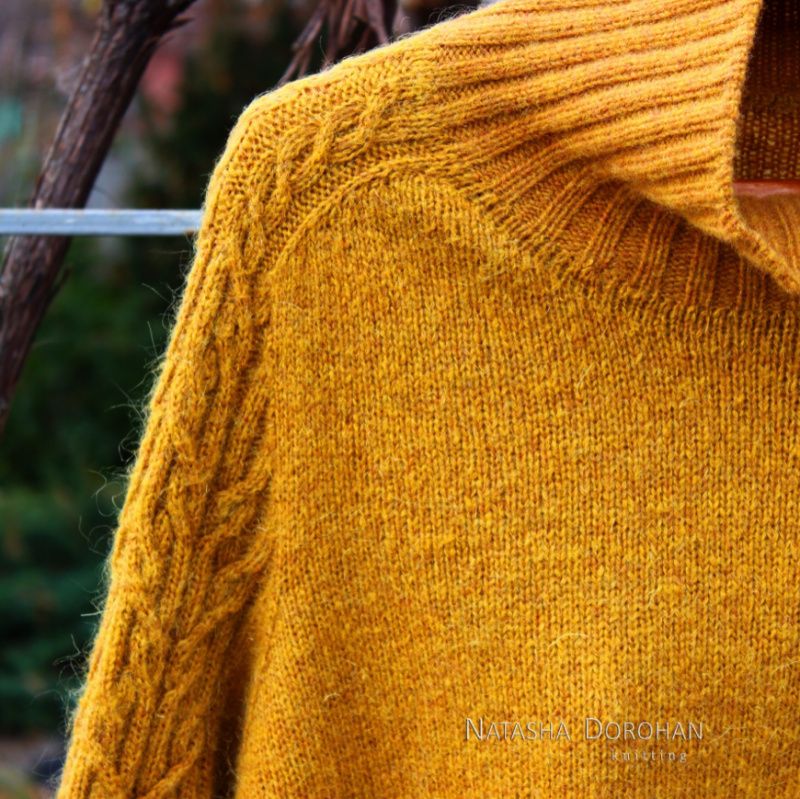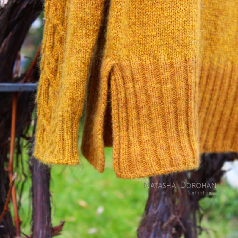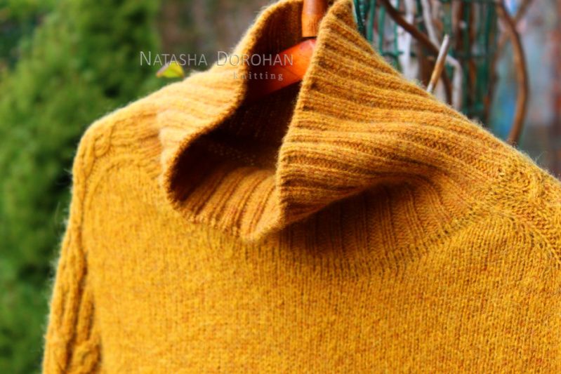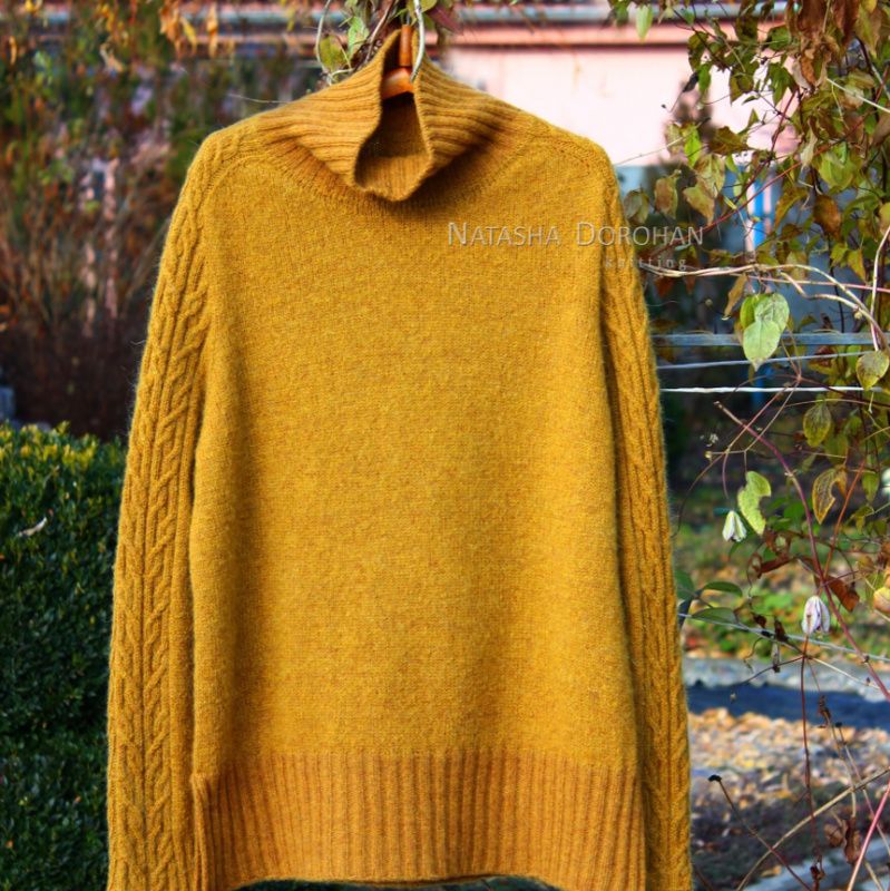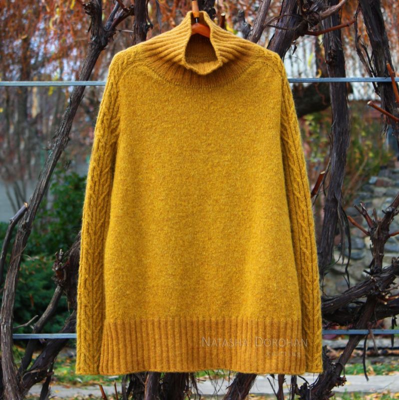Свитер связан вручную с итальянской пряжи сплошь без швов, сверху, средне-свободного кроя. По погону и вдоль рукава узор из кос. Реглан-погон, имитация вшивного рукава, высокий воротник-труба. По низу изделия разрезы на всю высоту резинки. Пряжа: одна нить кардного мериноса плюс одна нить кидмохера. Полотно объемное, рыхлое, приятное, невесомое, теплое. Слишком чувствительный мохер может покалывать. Цвет вживую не столь насыщенный, цвет сухой горчицы или сухих листьев. Учтена коррекция на грудь и по спинке. Размер ML Вес всего 320 гр