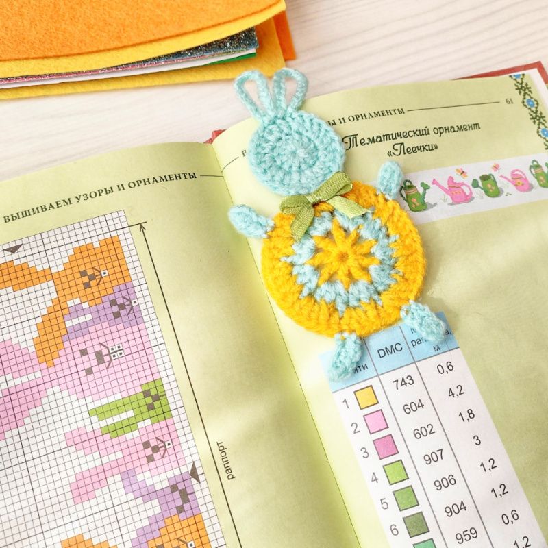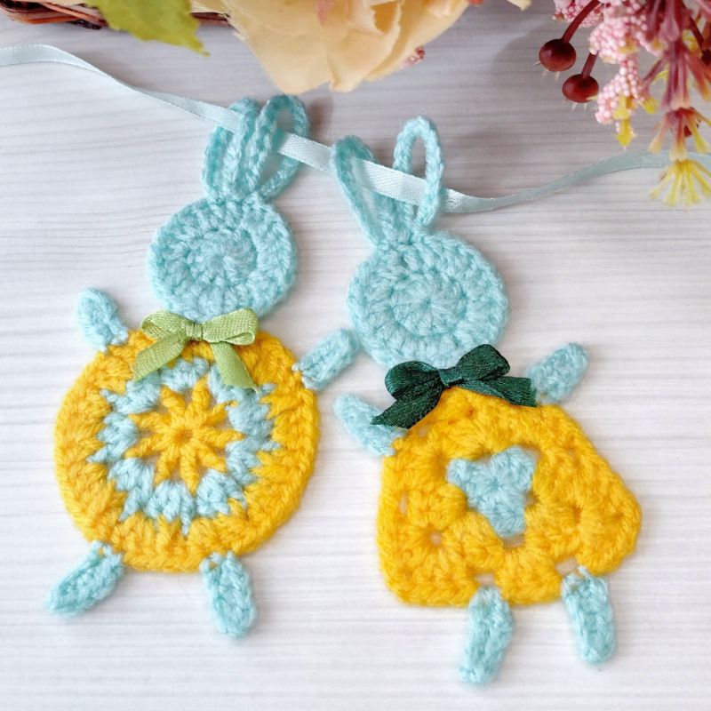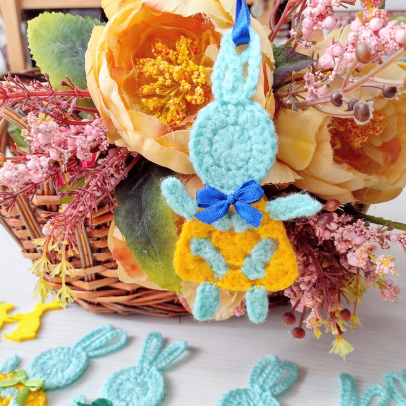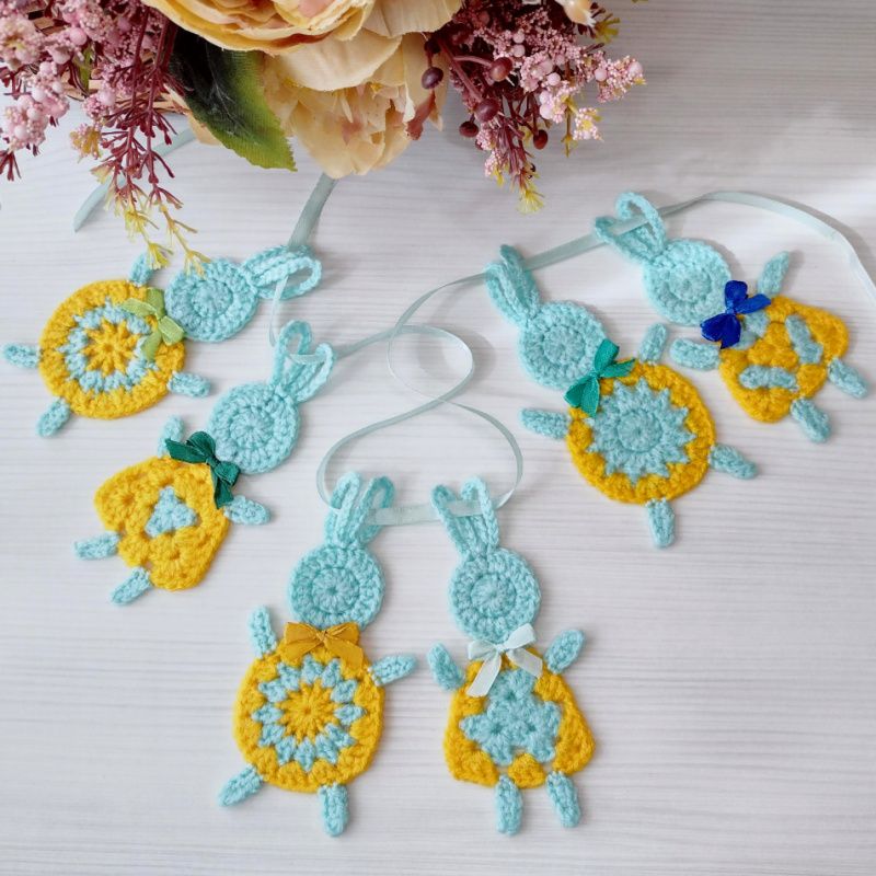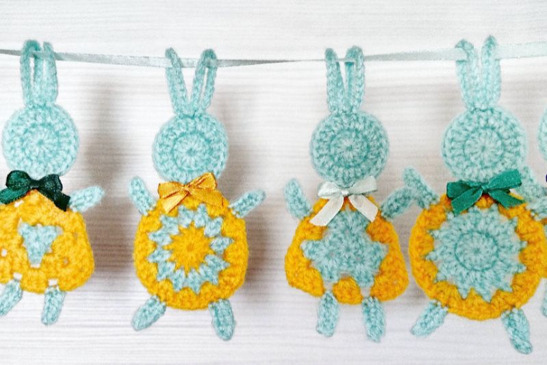Элементы гирлянды это зайчики, которые связаны крючком. Ни один узор не повторяется.