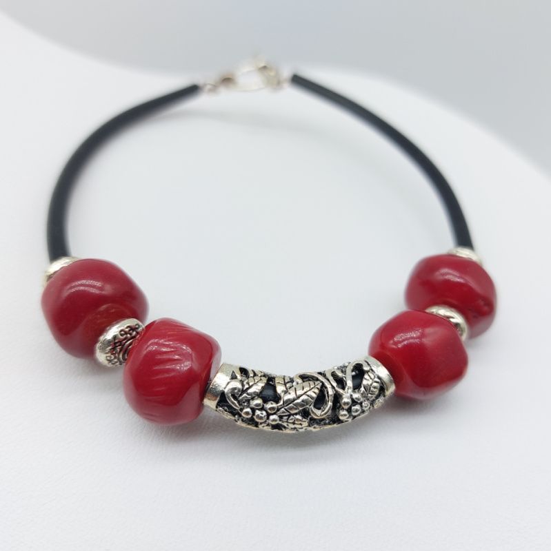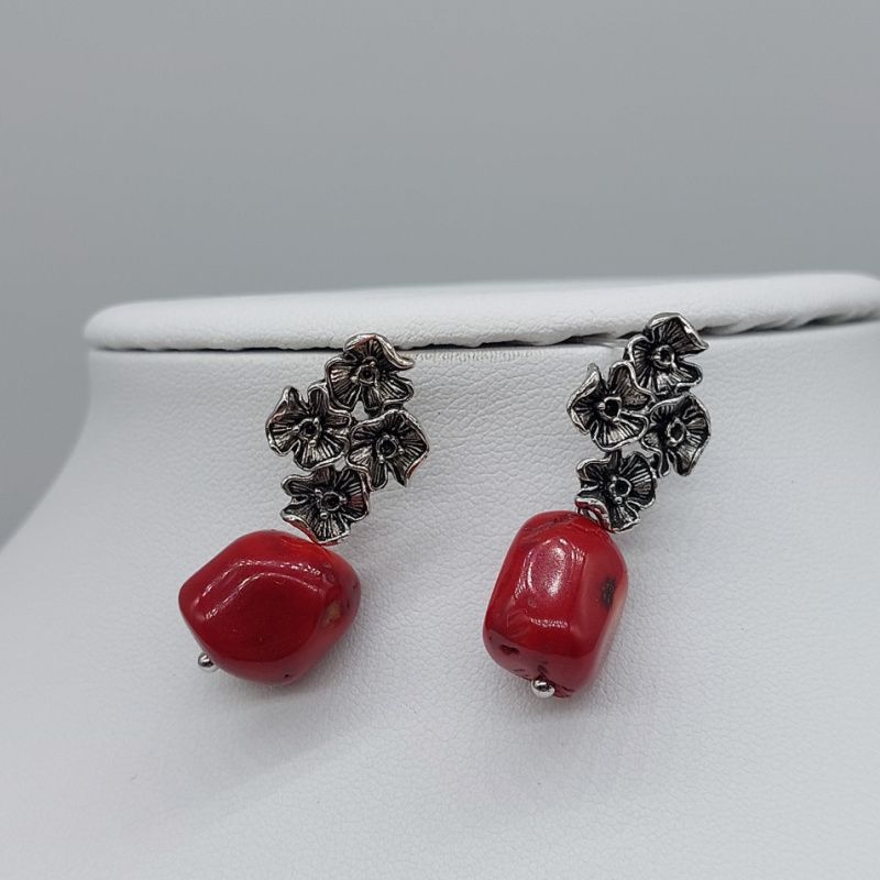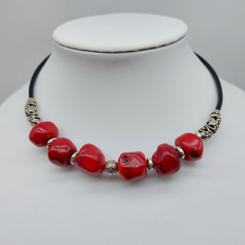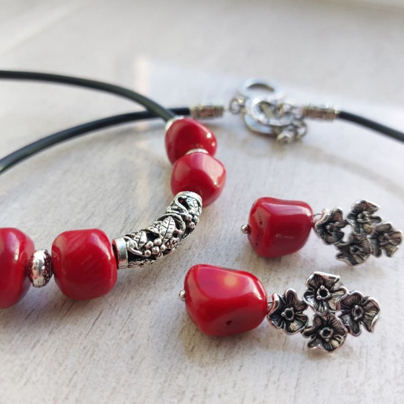 Комплект украшений из натурального коралла в сочетании с серебряными и гипоаллергенными бусинами