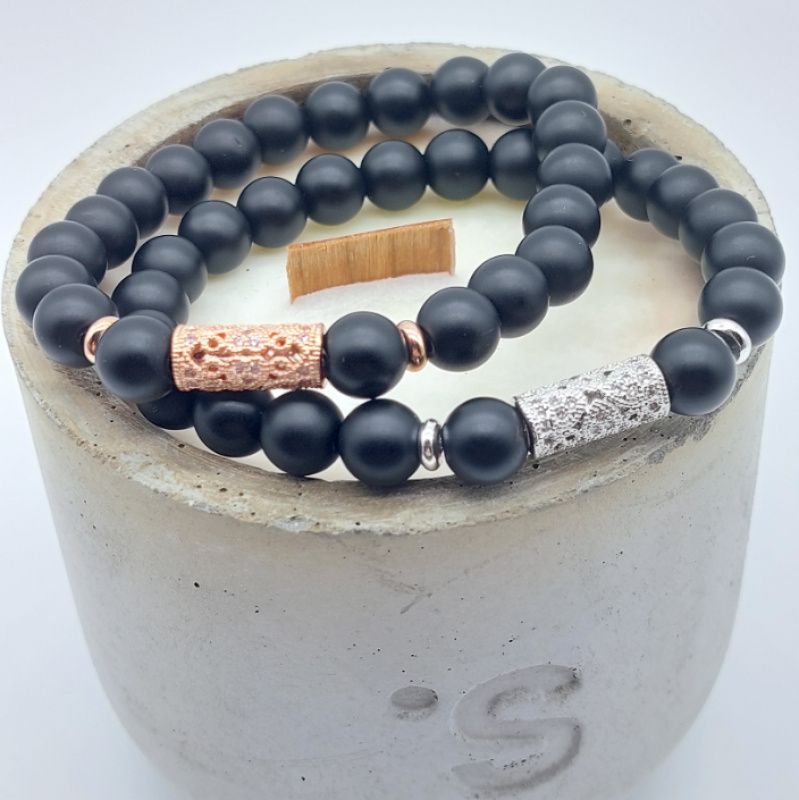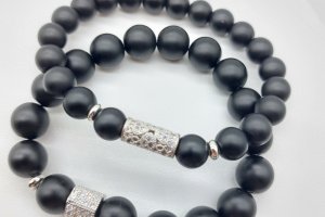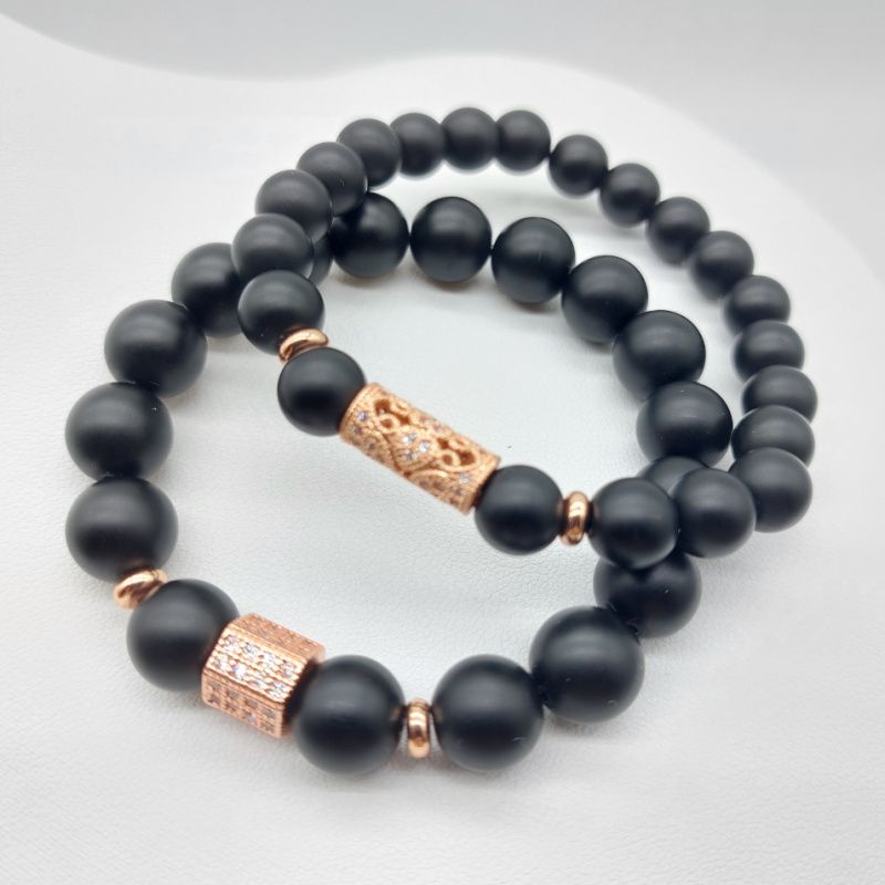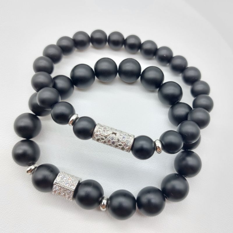 Парные браслеты из натурального камня Шунгит 8 и 10 мм с использованием инкрустированной фианитами