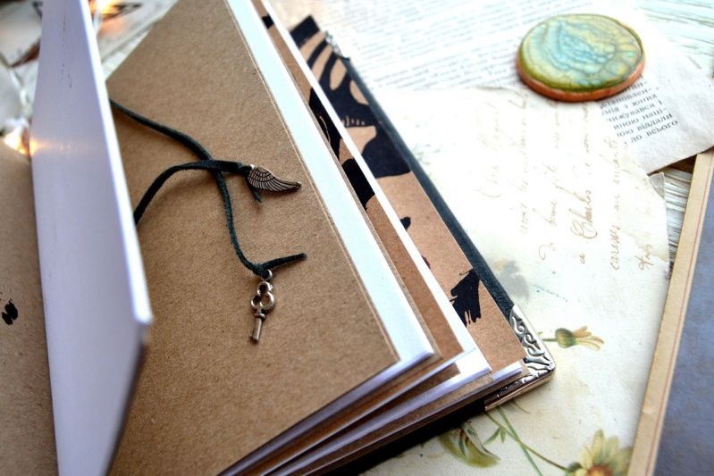 Больше не нужно вырывать страницы. Можно менять тетрадки местами или отдельные листы. Также есть четыре рисунка сделанные мной. Две закладки с подвесками. Углы защищены металлическими уголками .