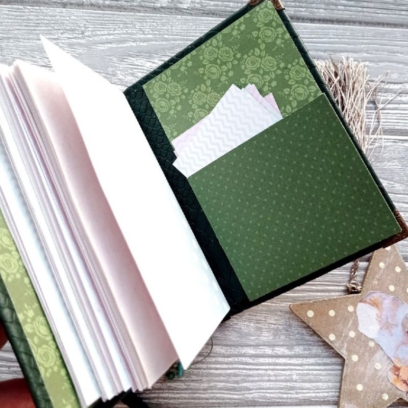 Внутри две закладки и кармашек для хранения визиток, стикеров, карты. Тетрадки с обложками из скрап бумаги, они же могут быть разделителями. Тоже легко можно вынуть или заменить.