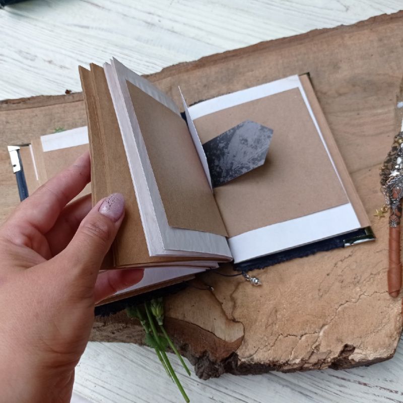 Очень атмосферный блокнот А6 формата (15\12 см по обложке). Из кусочков необычной натуральной кожи. Безумно тактильный. Углы защищены красивыми металлическими уголками. Обложка украшена накладкой. Есть две закладки с подвесками . Бумага крафт и состаренная (260с) также есть вставки из скрапбумаги.