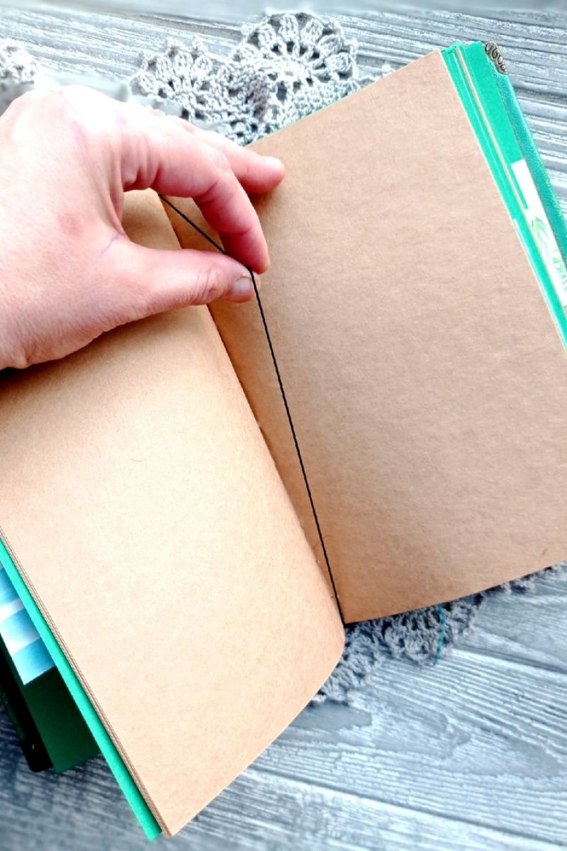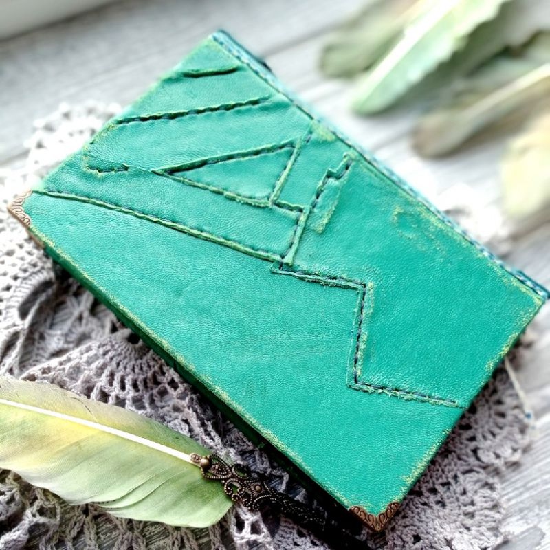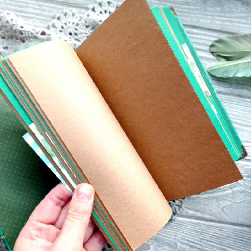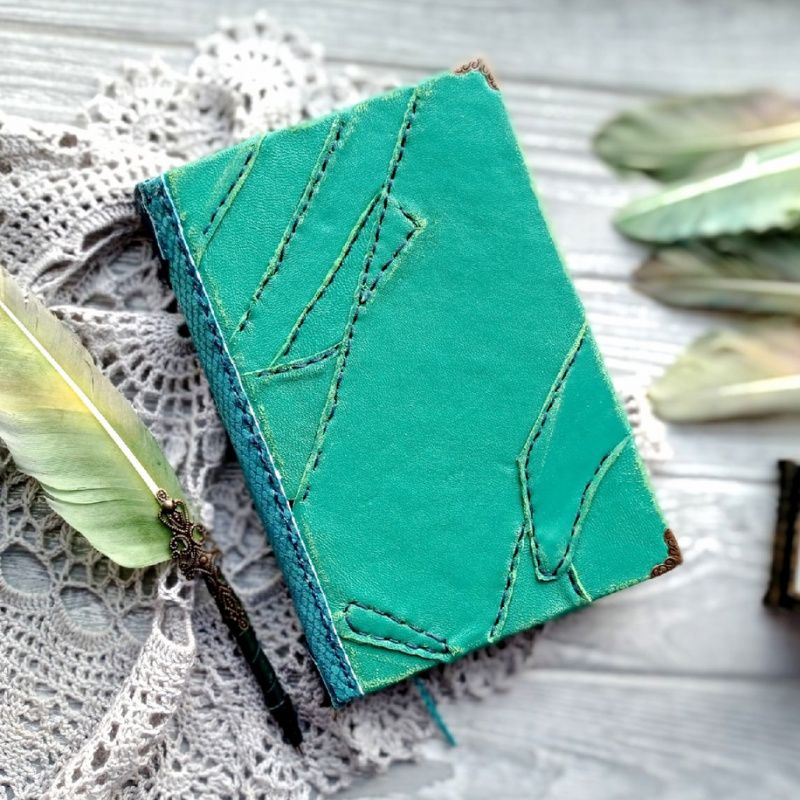 Блокнот из натуральной кожи трех видов. Цвет- удовольствие для глаз. Фактура- удовольствие для рук. Внутри крафт бумага кожаная закладка .Бумага сменная на резинках. Каждая тетрадка в зеленой обложке с вставкой из скрапбумаги.