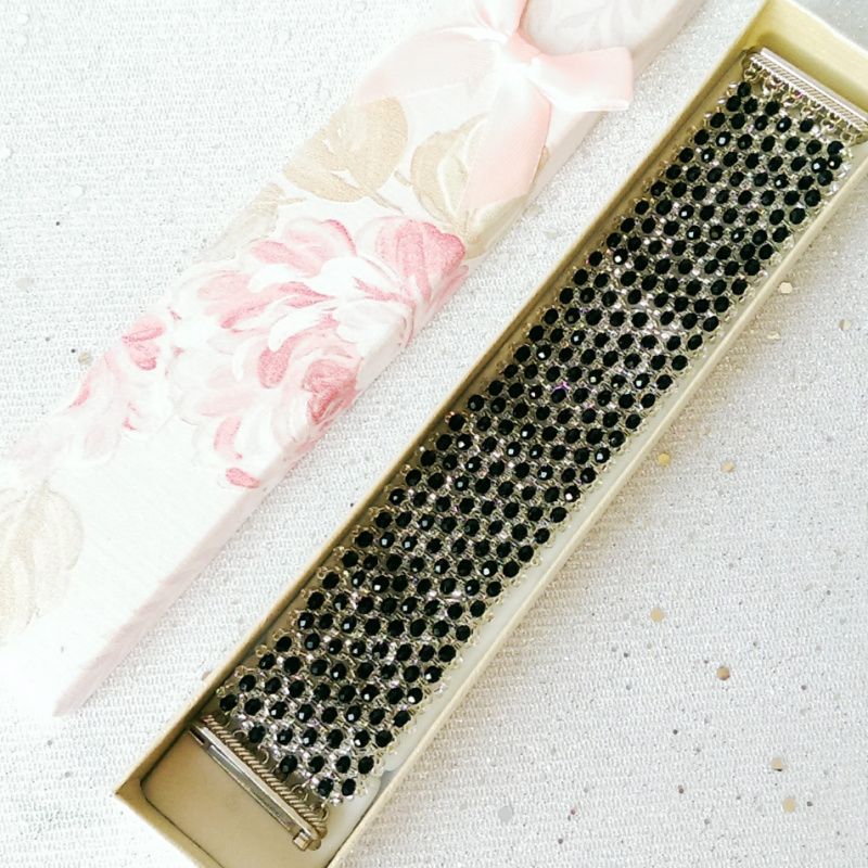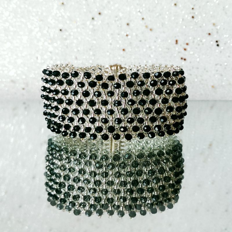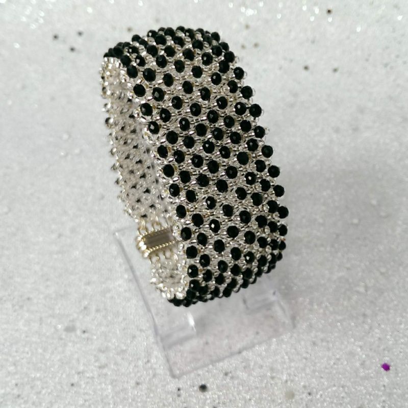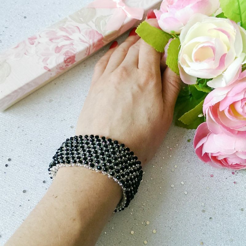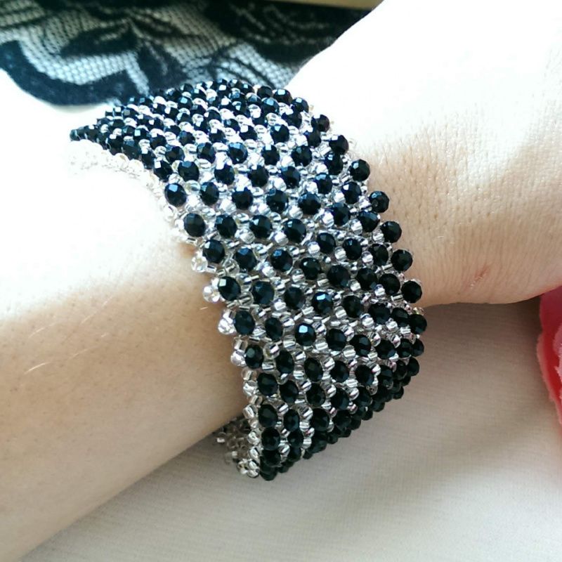 Широкий браслет сплетен из чешского бисера серебристого цвета и расшит черными хрустальными бусинами.