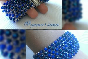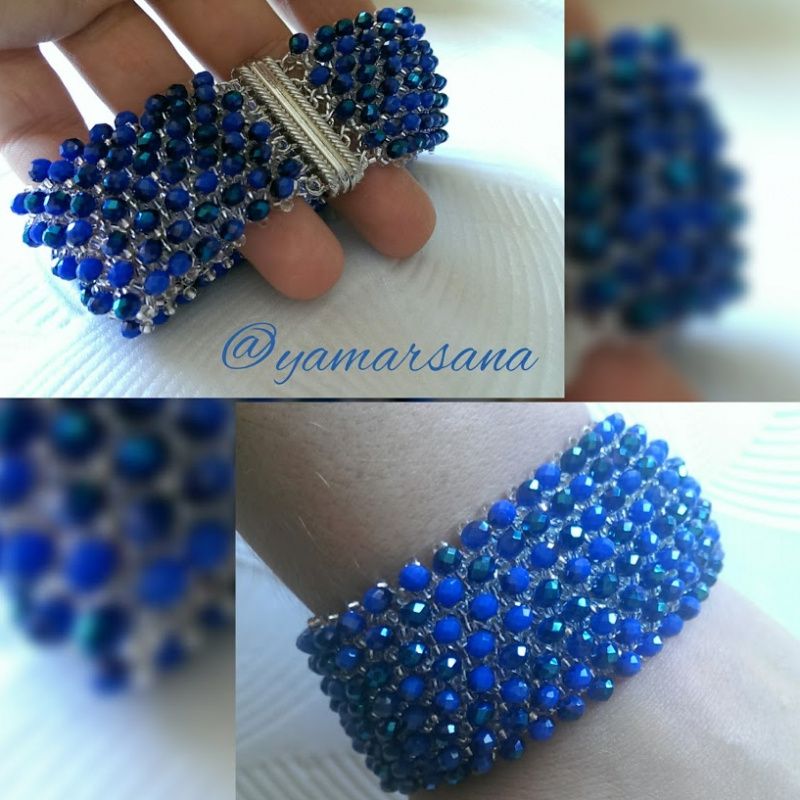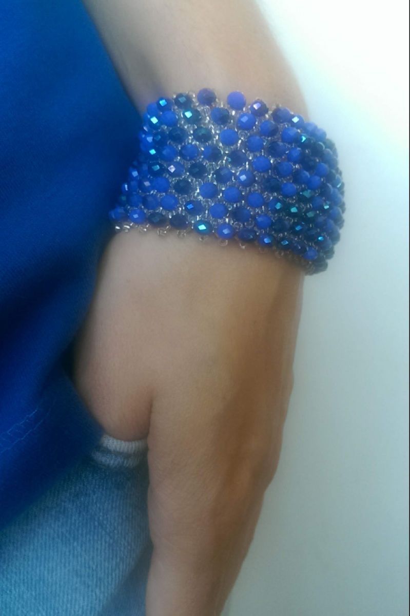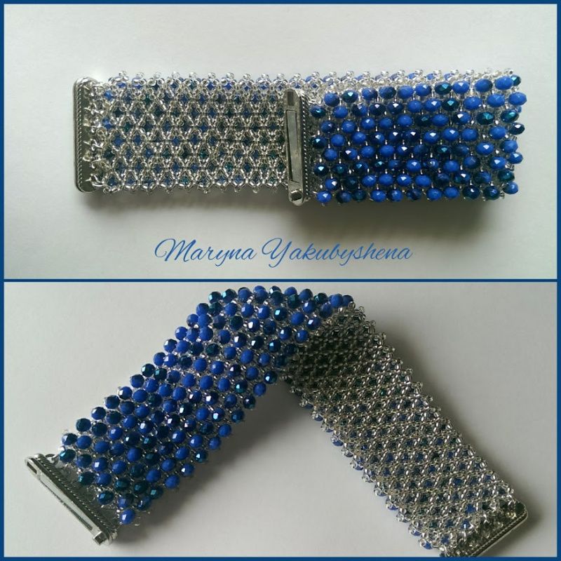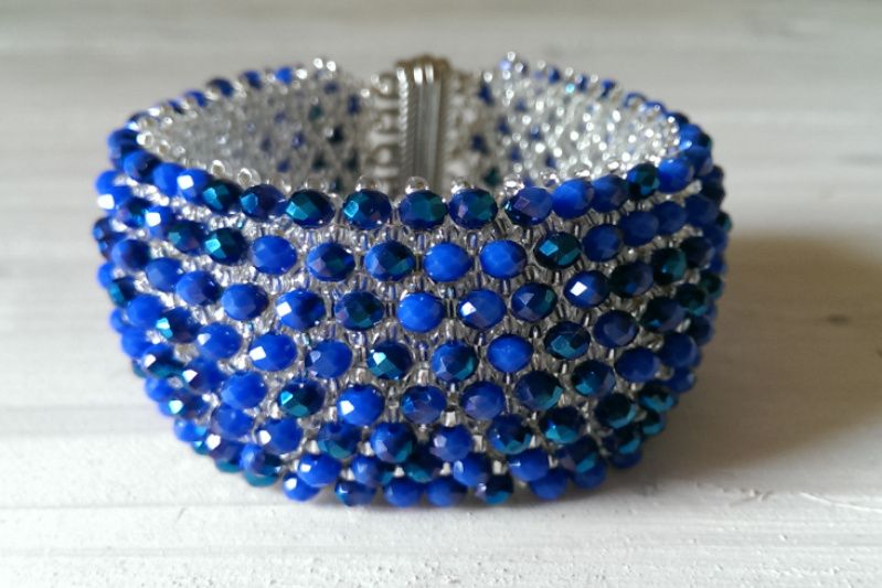 Широкий браслет сплетен из чешского бисера серебристого цвета и расшит синими хрустальными бусинами.