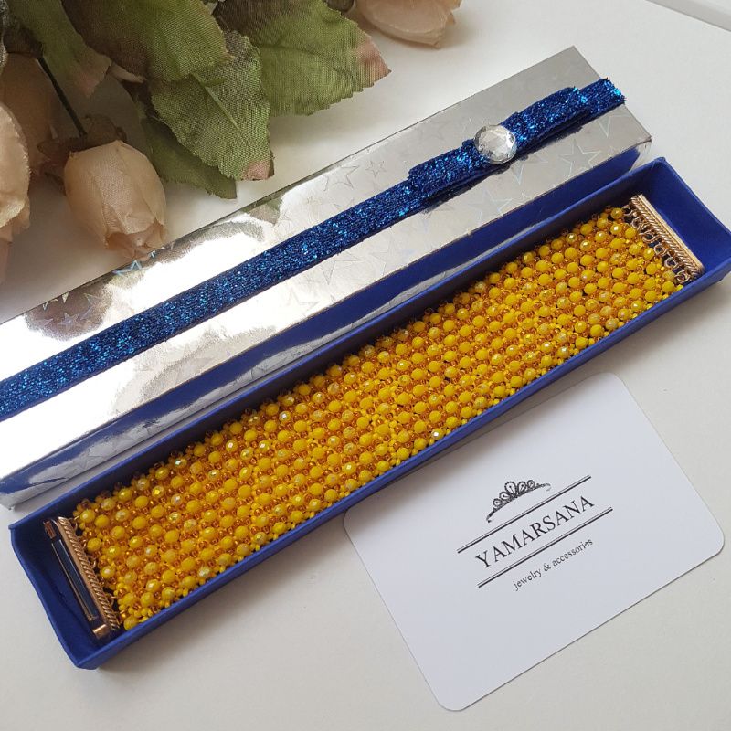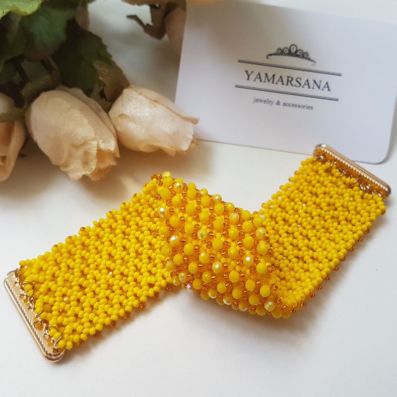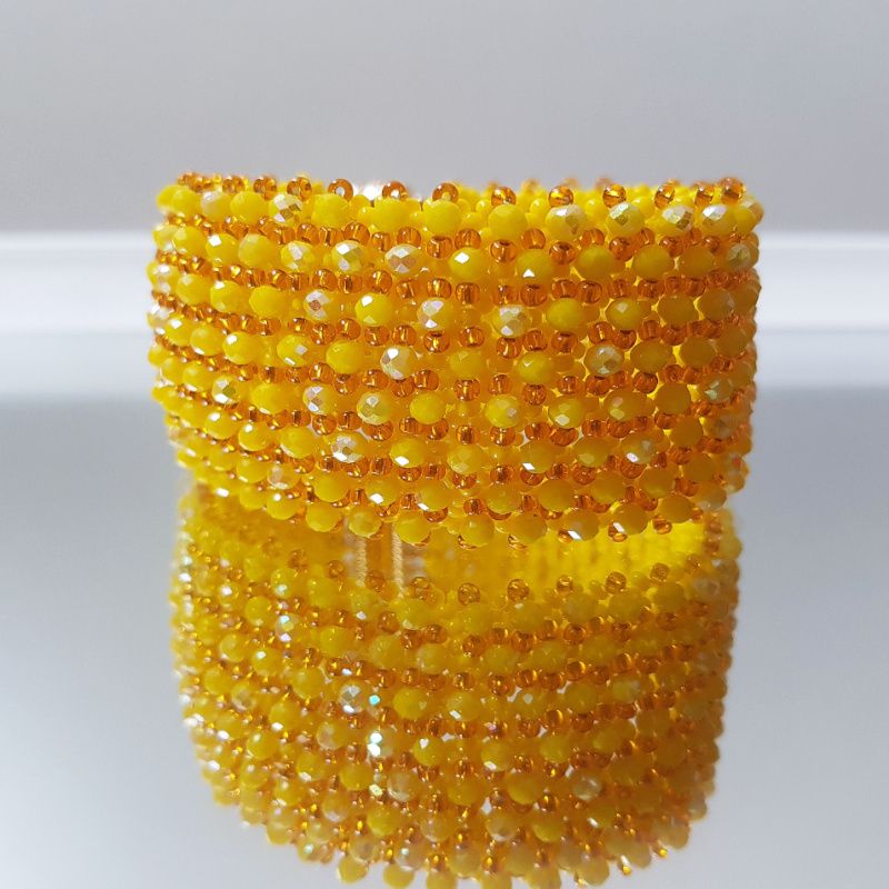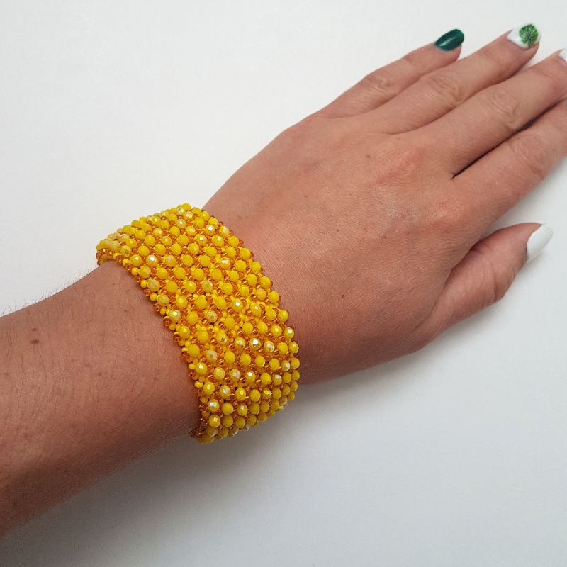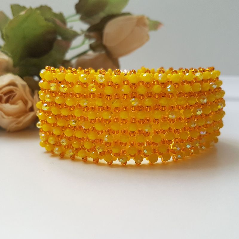 Широкий браслет сплетен из чешского бисера желтого цвета и расшит желтыми искрящимися хрустальными бусинами.