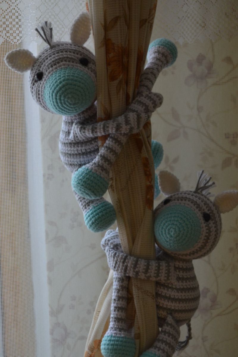 Подхваты для штор Зебрята. Связанные с полухлопком, наполненные холлофайбером и радостью. Глаза на безопасном креплении. Станут украшением детской комнаты. Рост около 15 см с ушками. Возможно исполнение в другом цвете и персонаже. Цена указана за пару