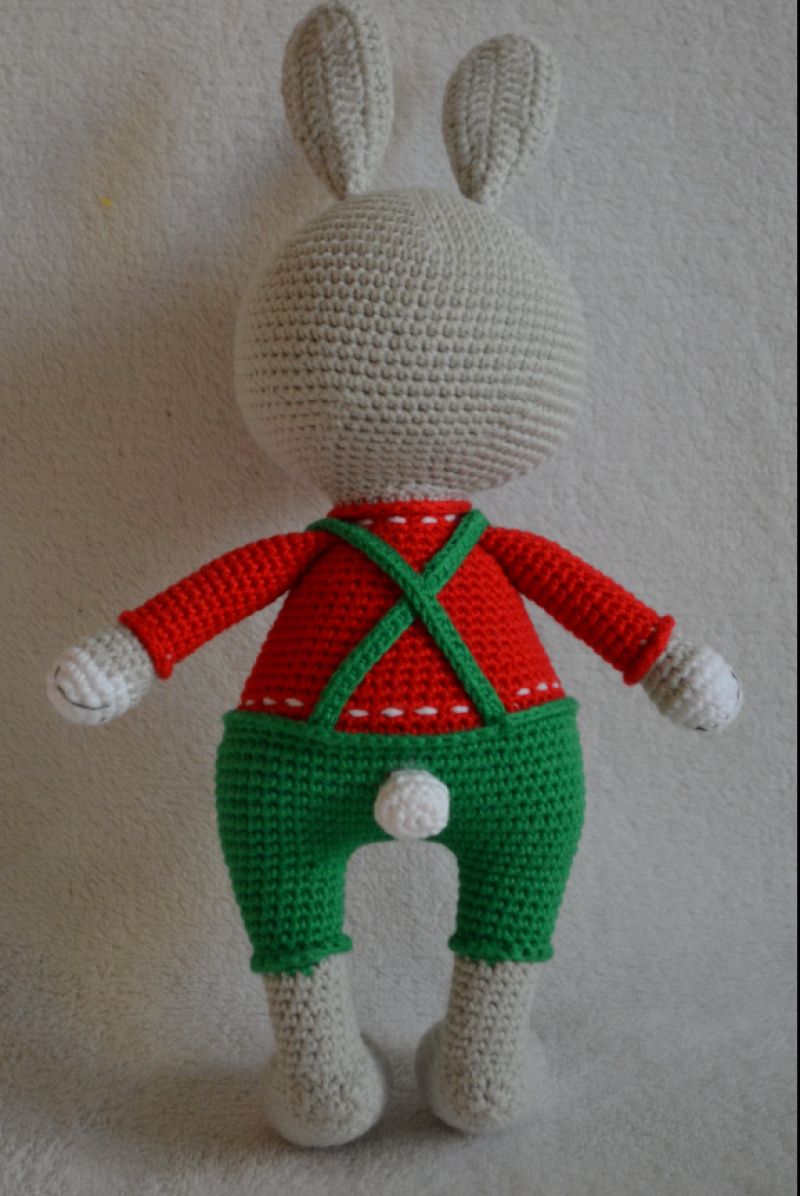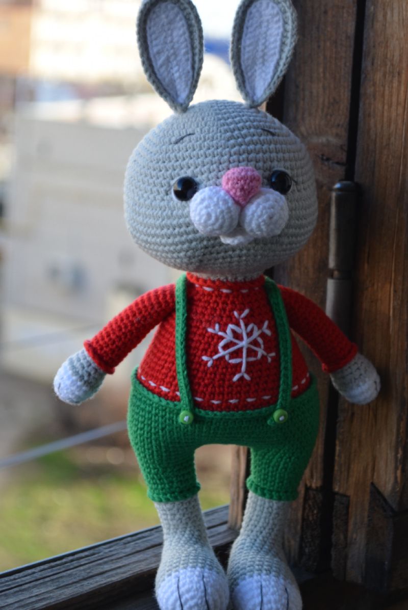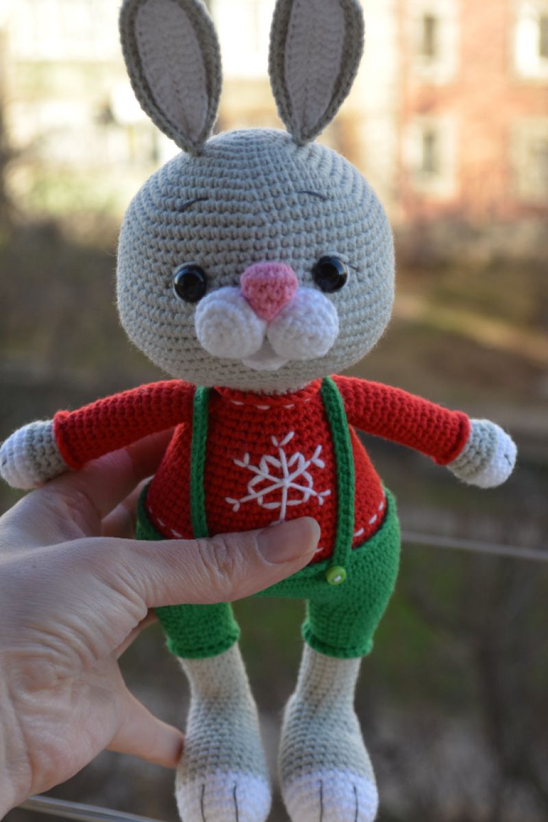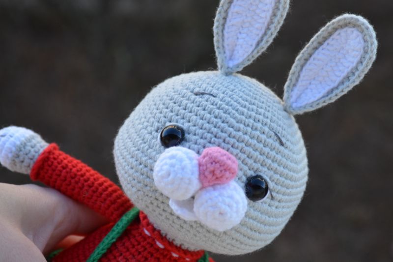 Зайчонок связан с полухлопком. Наполнен холофайбером. Глаза на безопасном креплении. Стоит с поддержкой, не сидит. Рост около 20 см, с ушками 26 см. Возможен повтор в других цветах